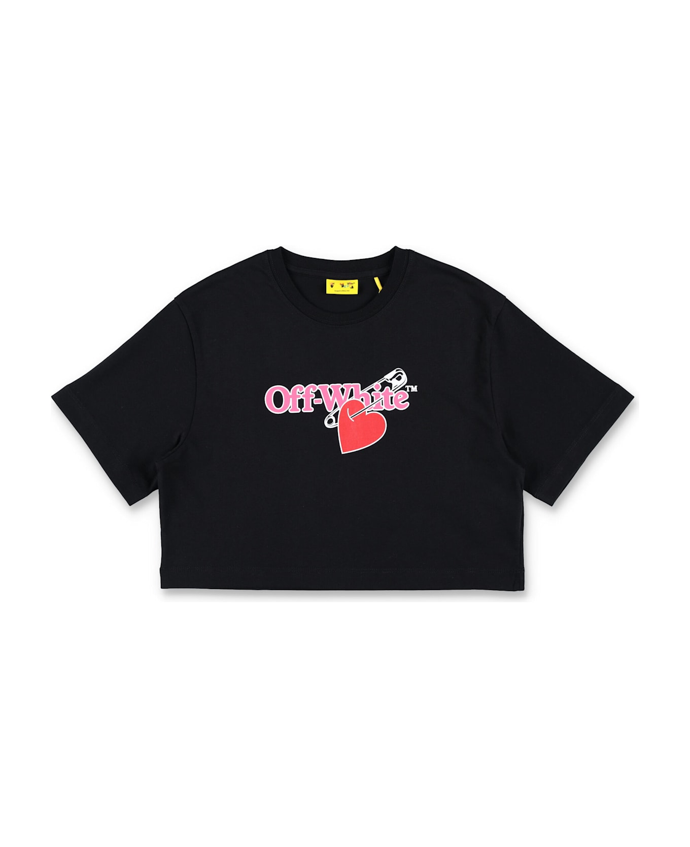 Playful Yet Urban, This Off-white Kids Cropped T-shirt Is Crafted From Soft Black Cotton. The Front Is Adorned With The Off-white Logo In Pink And A Bold Red Heart Pierced By A Safety Pin, Showcasing The Brand s Signature Graphic Style. With Its Ribbed Crewneck And Short Sleeves, It Adds A Contemporary Twist To Casual Everyday Outfits. Pink Off-white Logo With Red Heart Print