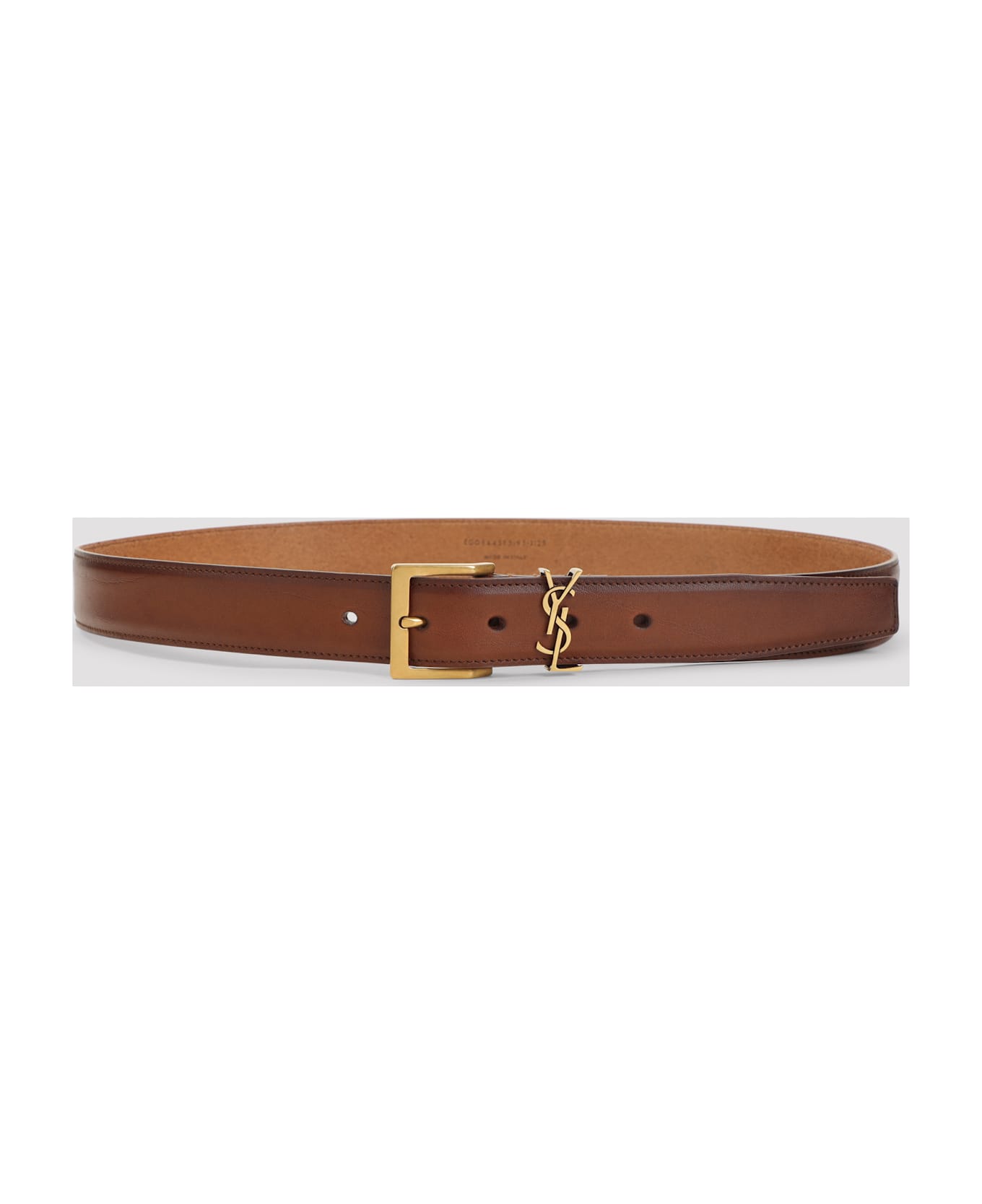 Saint Laurent Ruby Rust Brown Leather Belt. Pure ruby rust leather brown belt, front gold-tone metallic buckle, adjustable design, gold-tone metallic belt loop with signature YSL logo.