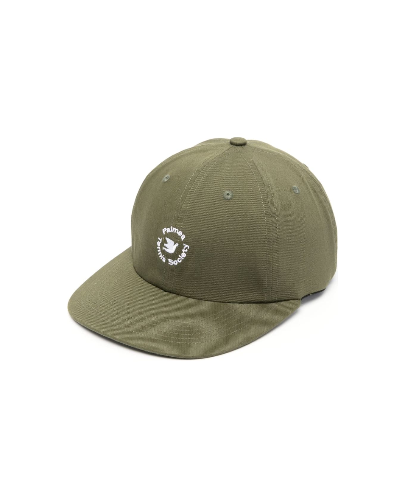 olive green six-panel construction flat peak tonal stitching embroidered logo to the front eyelet detailing fabric-covered button at the crown adjustable strap to the rear