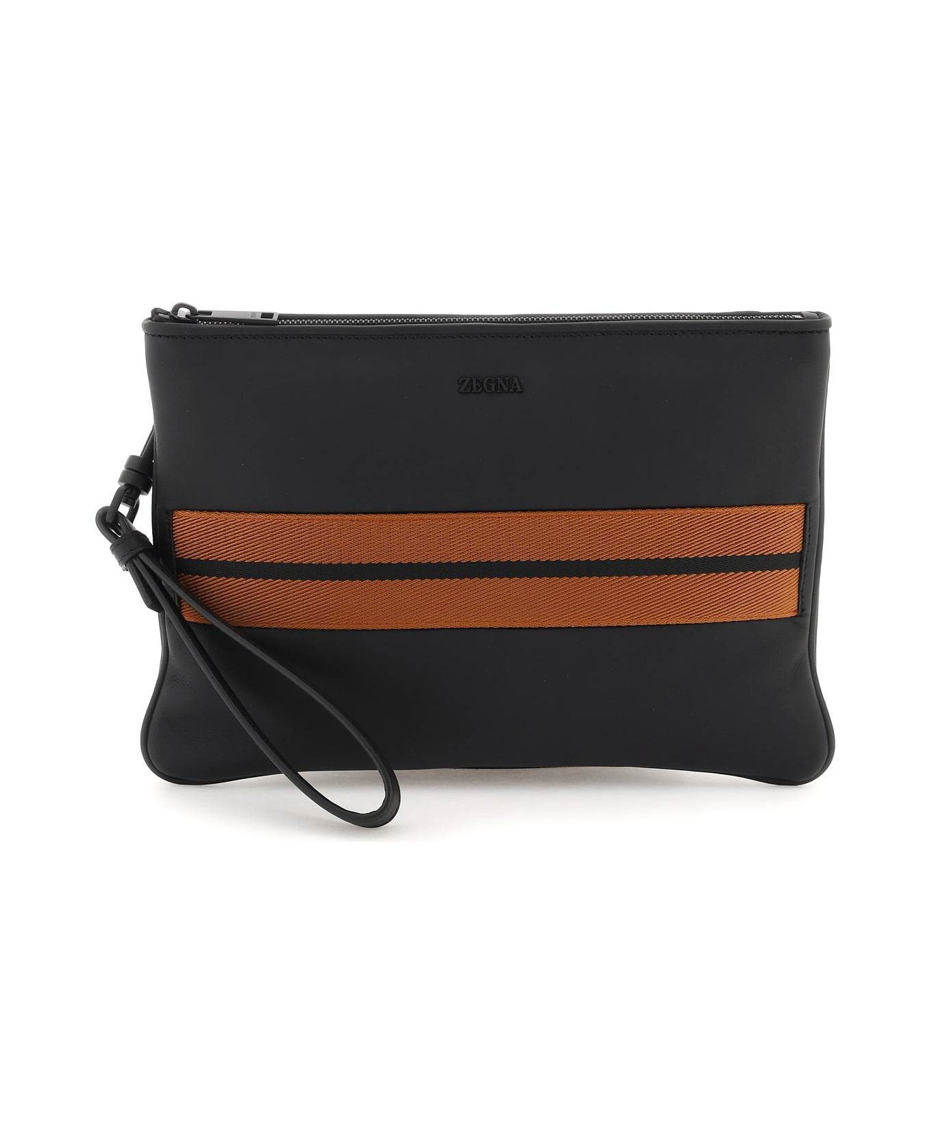 Zegna flat pouch crafted in soft leather, enriched by a tonal metal logo lettering applique and by contrasting grosgrain bands on the front. Zip closure, fabric interior with two open pockets and a zippered flap pocket. Removable leather handle, tone-on-tone metalware. Composition: 100% LH