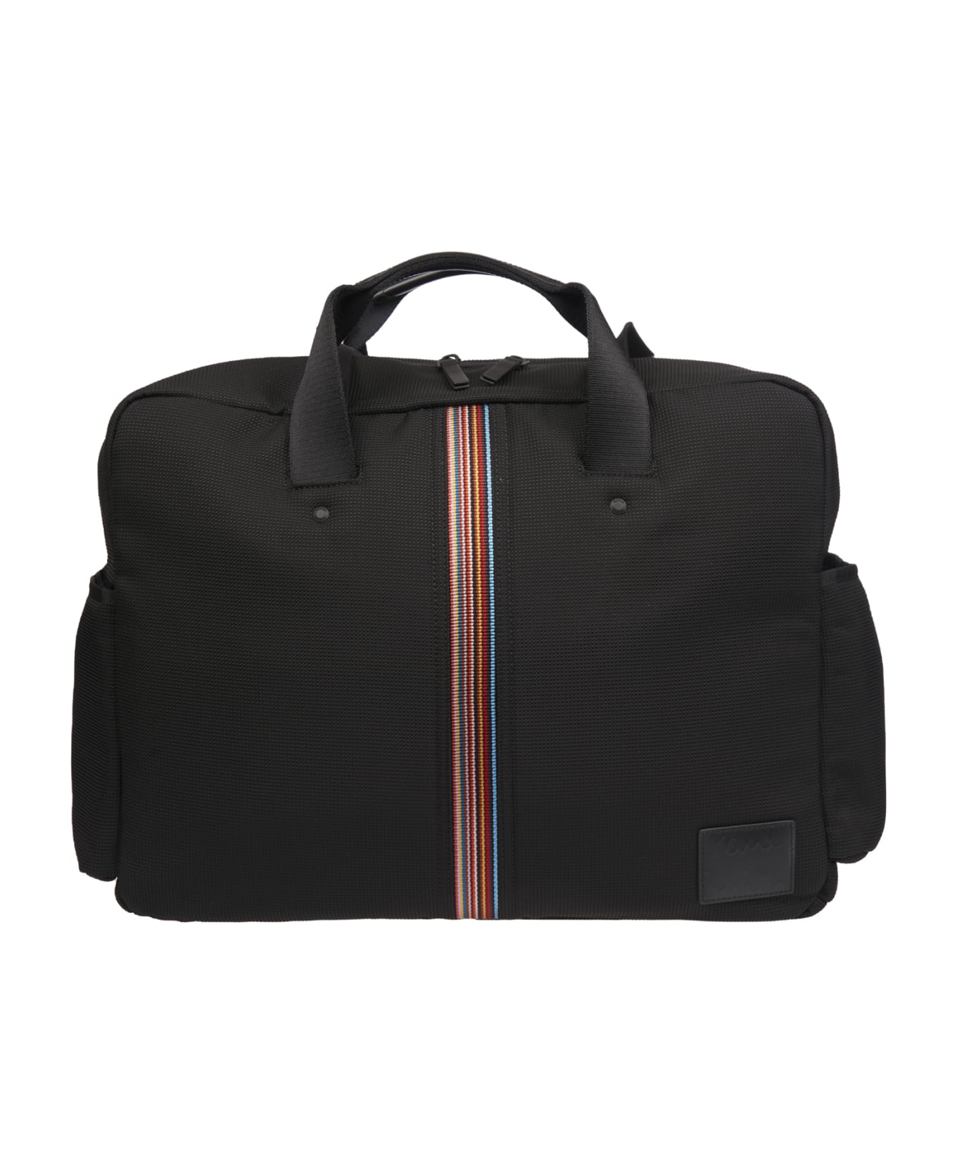 Black travel bag with multicolor striped detail. Zip closure. Inside pocket with zip. Patch with embossed logo on the front. Double handle. Dimensions: 34 x 44 x 21 cm. Composition: 100% polyamide and leather finishes. Made in Thailand.