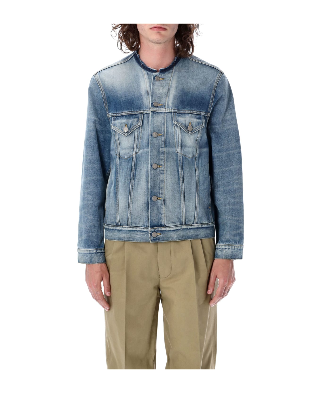 Cotton Collarless Denim Jacket By Maison Margiela. Featuring: Collarless Silhouette With Raw Edges Buttons Closure Chest Flap Buttoned Pockets Side Slit Pockets Long Sleeves Buttoned Cuffs Straight Hem The Model Is 1,72 M Tall And She's Wearing Size 48