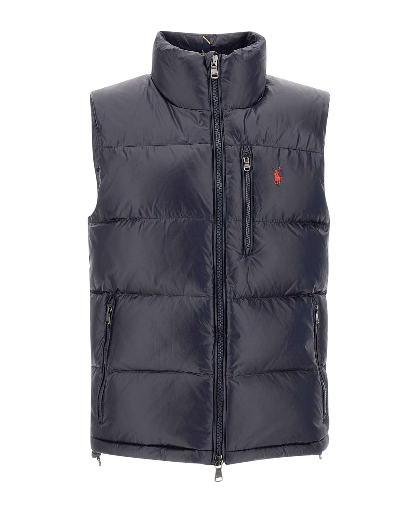 Polo Ralph Lauren "Classics" men's vest, navy blue, padded with down, double slider zip closure, side pockets with zip, chest pocket with vertical zip, iconic red logo on chest, adjustable drawstring at hem, high collar, regular fit.