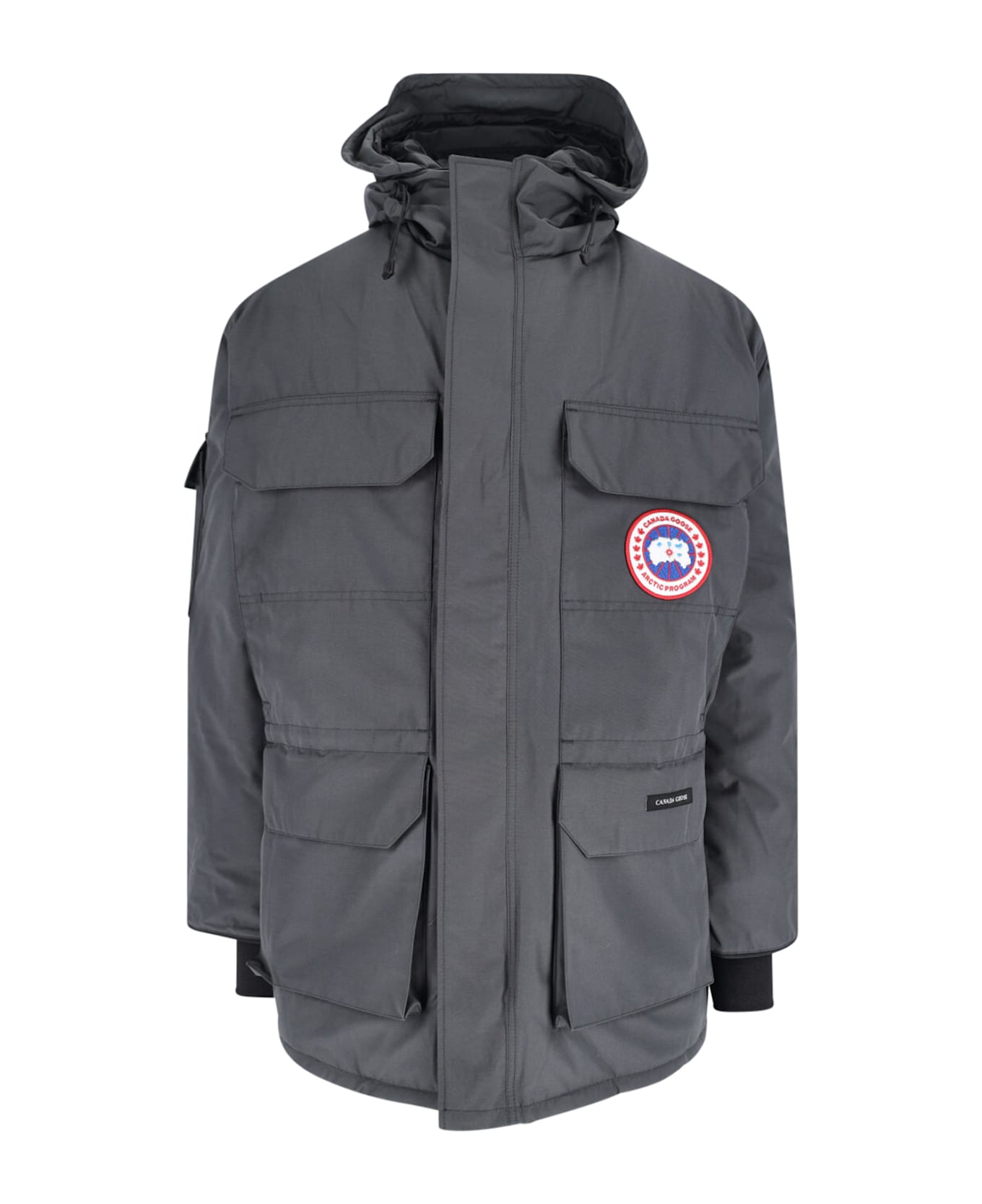 Canada Goose 'Expedition' jacket in dark grey water-repellent fabric with drawstring hood, double hidden zip closure, two front pockets, multicolor logo patch on the front, two side pockets, one sleeve pocket, logo handle detail at the back, inner elastic shoulder straps, ribbed cuffs, straight hem.