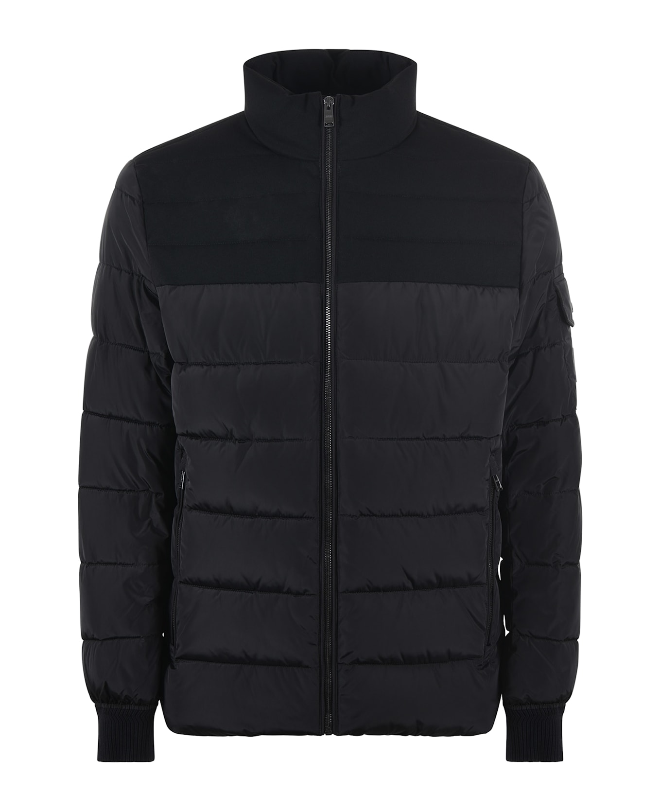 Boss jacket in black quilted nylon. Flannel top. Padded. Polo neck. Zipped pockets. Internal pocket. Ribbed cuffs. Zip closure. Measurement in photo 48 100% polyester 88% cotton, 7% polyamide, 5% elastane Padding: 100% polyester