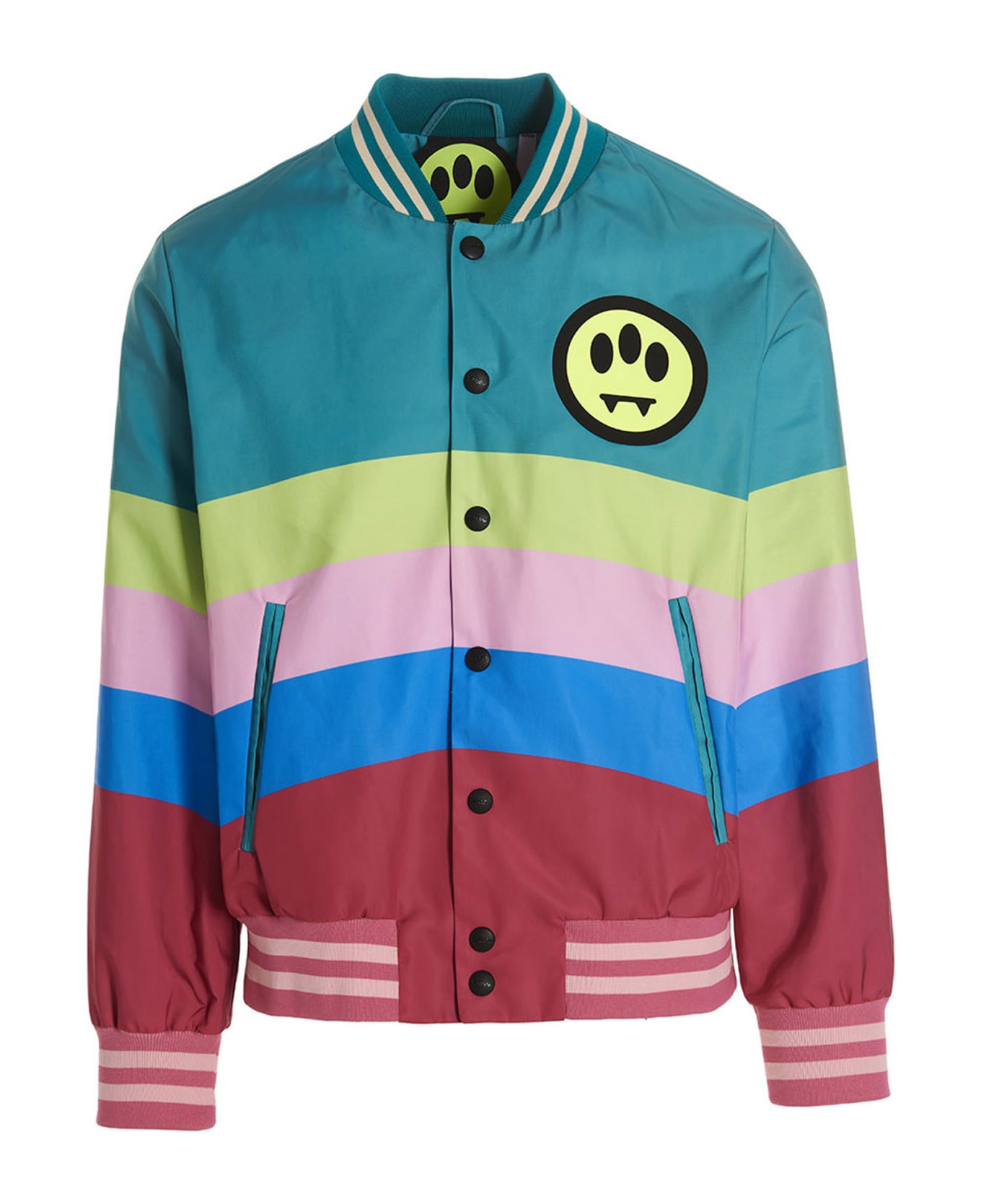 Multicolor nylon bomber jacket with front logo print, back logo embroidery, button closure, pockets, long sleeves with knit cuffs. Composition: 100% polyester
