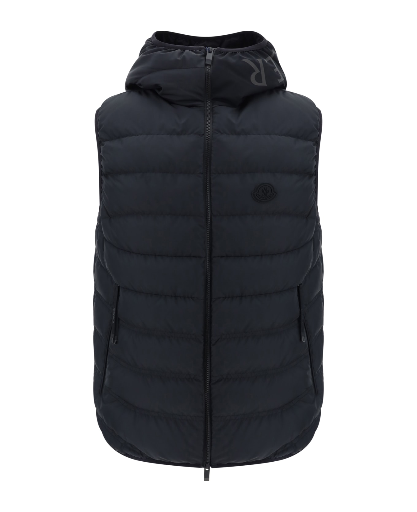 Nubiera down gilet by moncler, hooded design with contrasting printed brand monogram, front closure by double-slider zipper, two welt pockets with front zipper, all-over quilted and padded design, rubber patch with iconic brand monogram applique on front, regular fit.