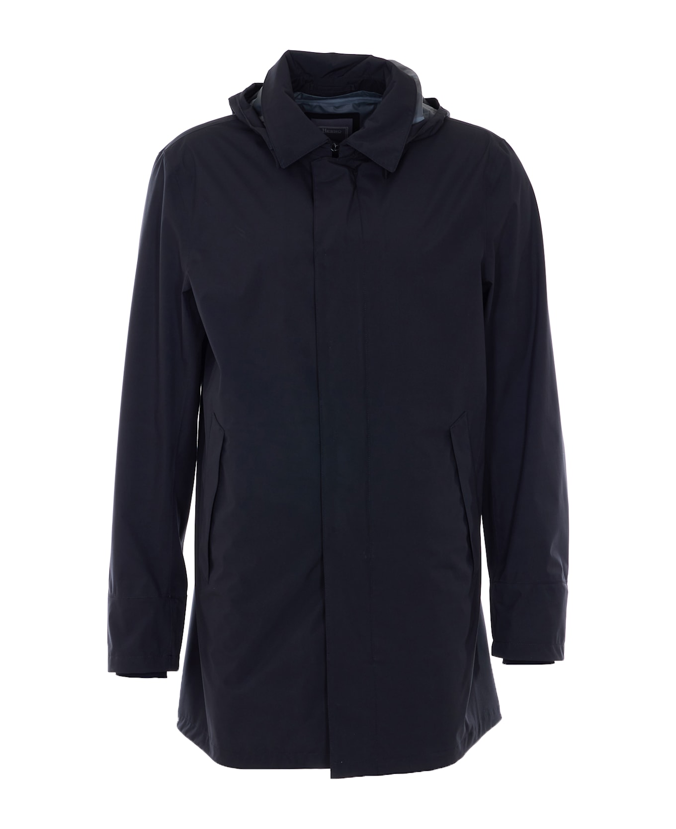 Herno black raincoat with frontal zip and buttons closure, removable hood detail, long sleeves, lateral pockets Composition: 100% Polyester, 100% Polyurethane, 75% Polyamide, 25% Elastane