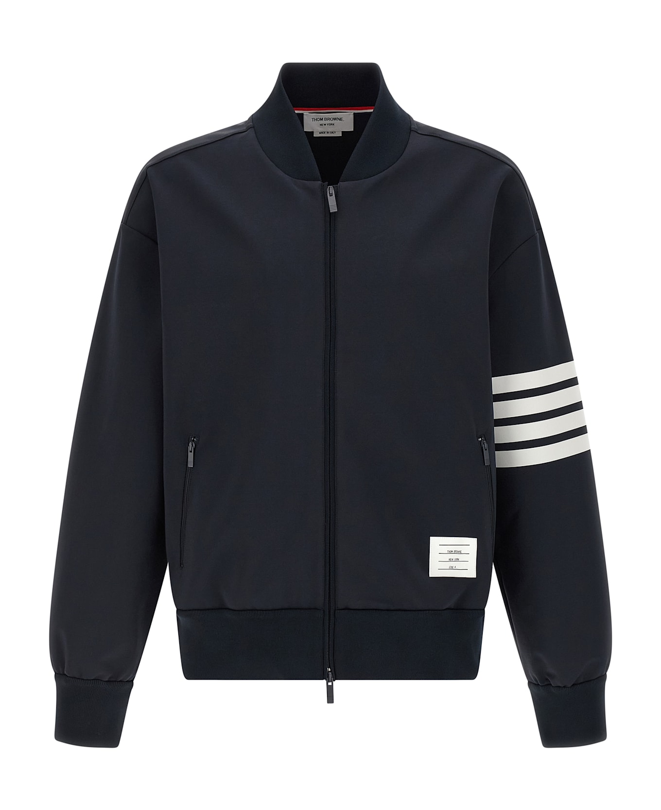 Tech viscose bomber jacket with tone-on-tone ribbed stretch knit details, logo patch and front zip closure, pockets, long sleeves with 4BAR print, dropped cuffs and shoulders, and headband. Composition: 73% viscose 23% polyamide 4% elastane