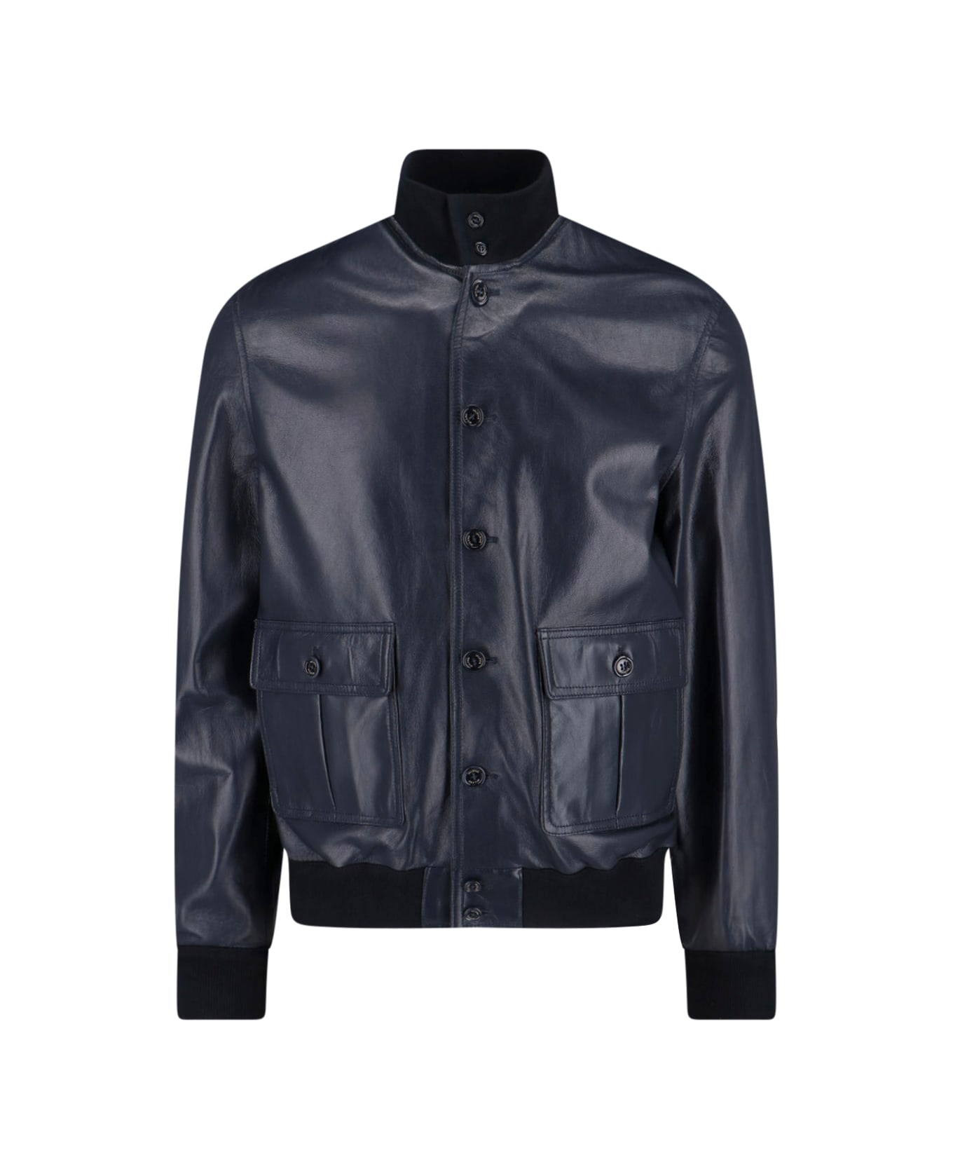 Valstar 'Valstarino' dark blue nappa leather jacket with ribbed high neck, button closure, two front button pockets, inner button pocket, ribbed stretch trims, straight hem. Composition: 100% Leather