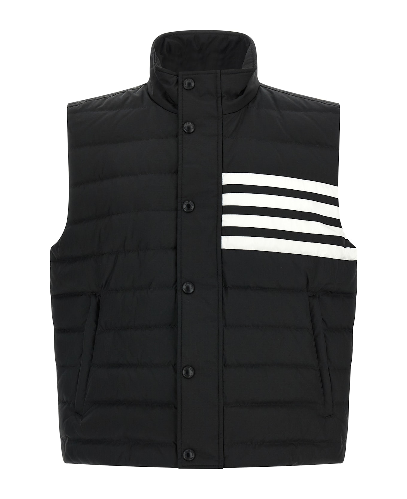 Lightly quilted shiny ripstop vest with goose down padding with contrast nylon '4 Bar' insert on the front, stand-up collar, zip and snap button closure, pockets, striped fabric lining. Composition: 81% polyamide, 19% polyester