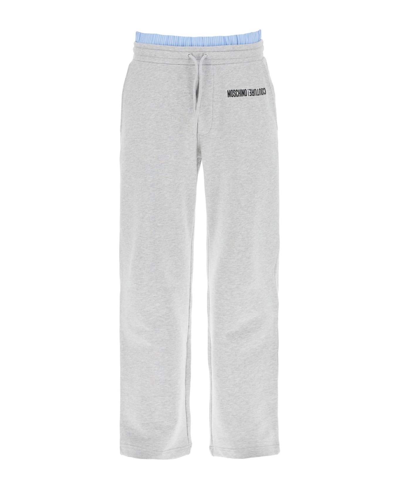 Moschino jogger pants made of pure brushed cotton jersey, decorated with contrasting embroidered logo lettering on the front and finished with a striped poplin boxer-style insert. They feature an elastic waistband with drawstring, French front pockets, and a back welt pocket. Relaxed fit. The model is 187 cm tall and wears size IT 48.