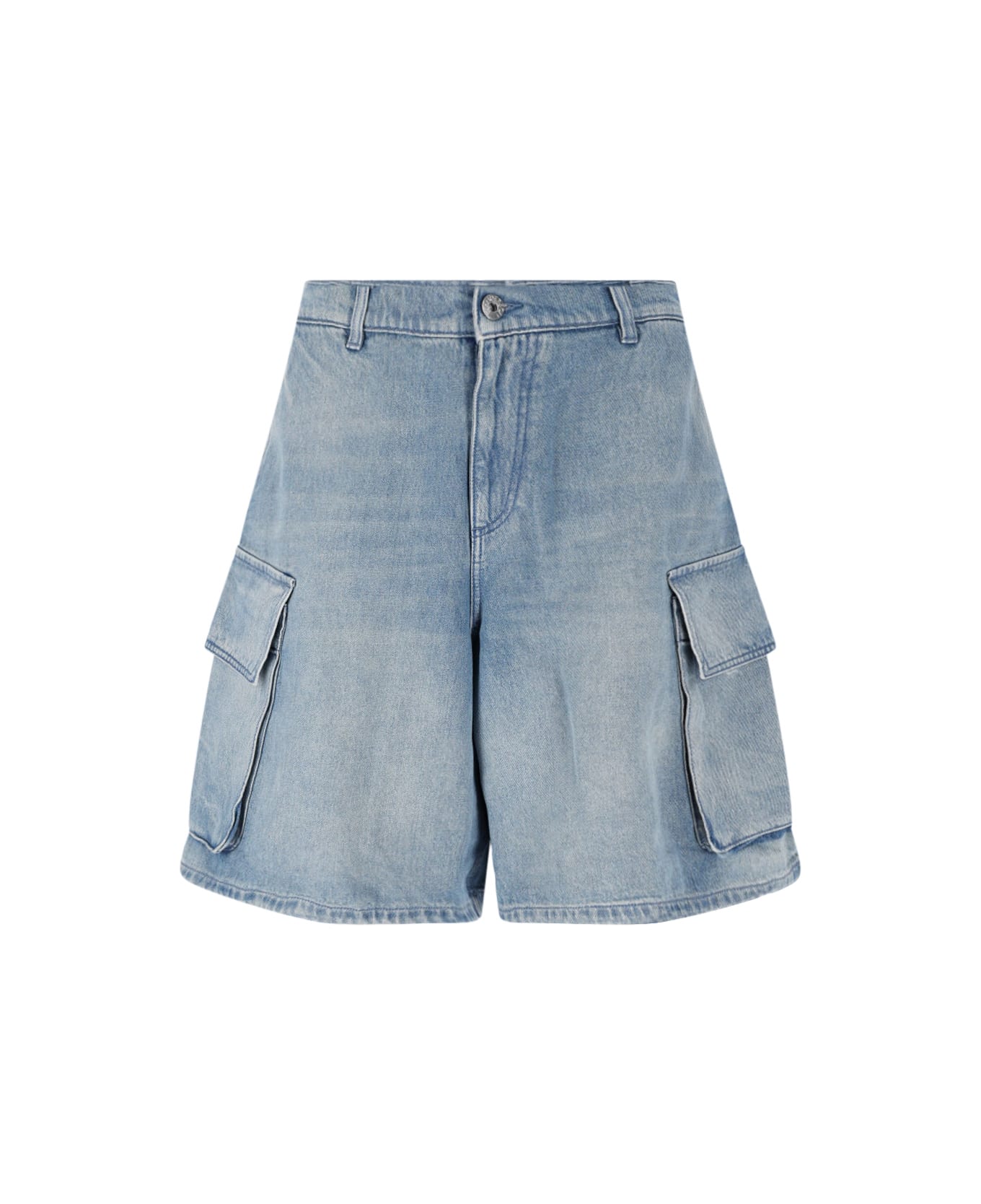 J. W. Anderson blue cargo shorts in denim with distressed wash, Bermuda design, mid waist, belt loops, button and zip closure, two side pockets, two side cargo pockets, back logo label, back flat pocket, wide leg.