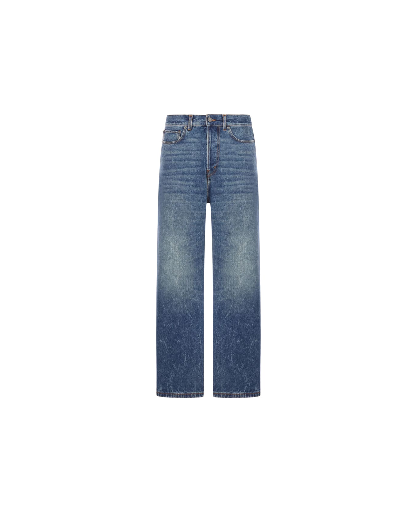 blue cotton five-pocket styling button fly belt loops whiskered effect