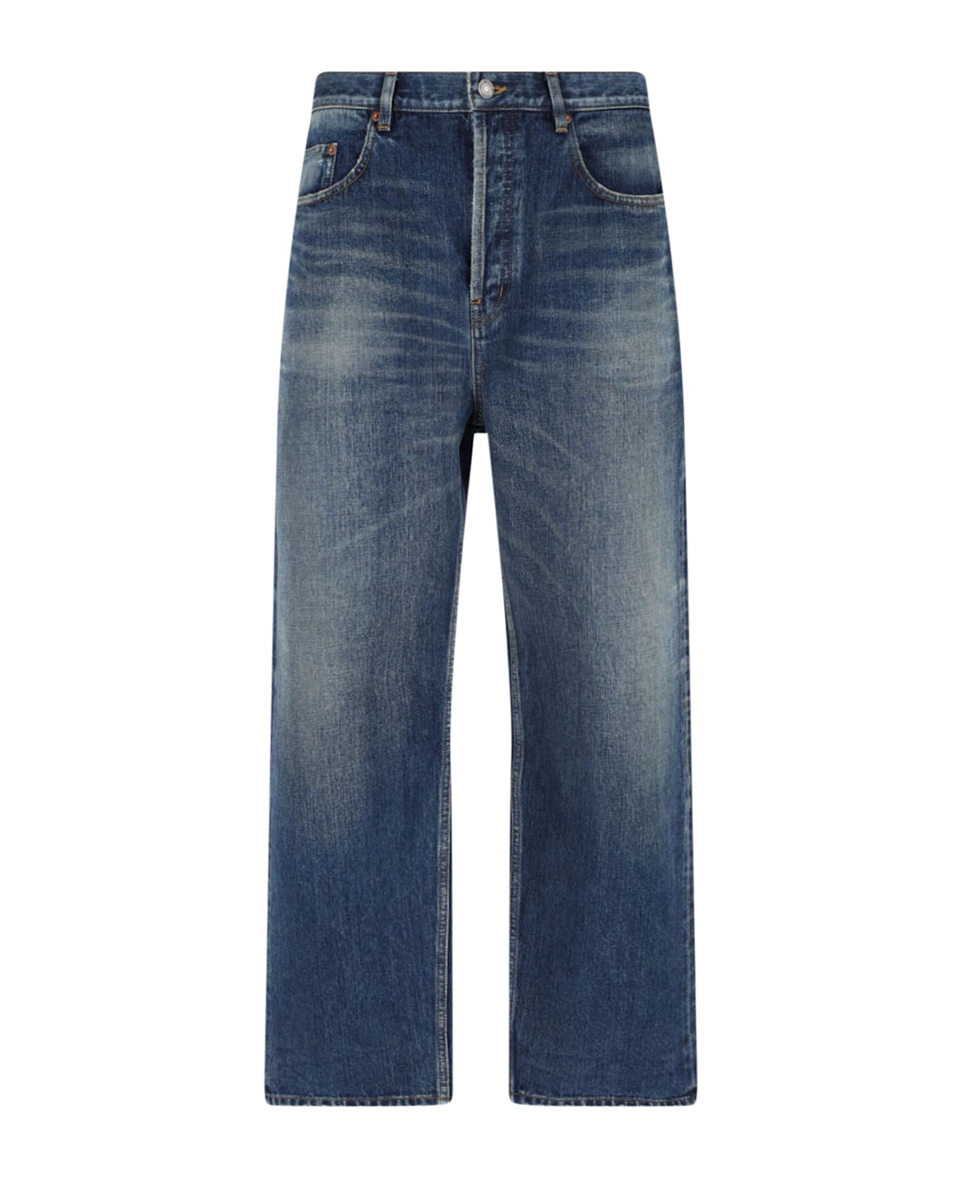 Saint Laurent straight blue denim jeans with distressed wash, high waist, belt loops, button closure, five pockets, logo patch on the back, straight leg. Composition: 100% Cotton