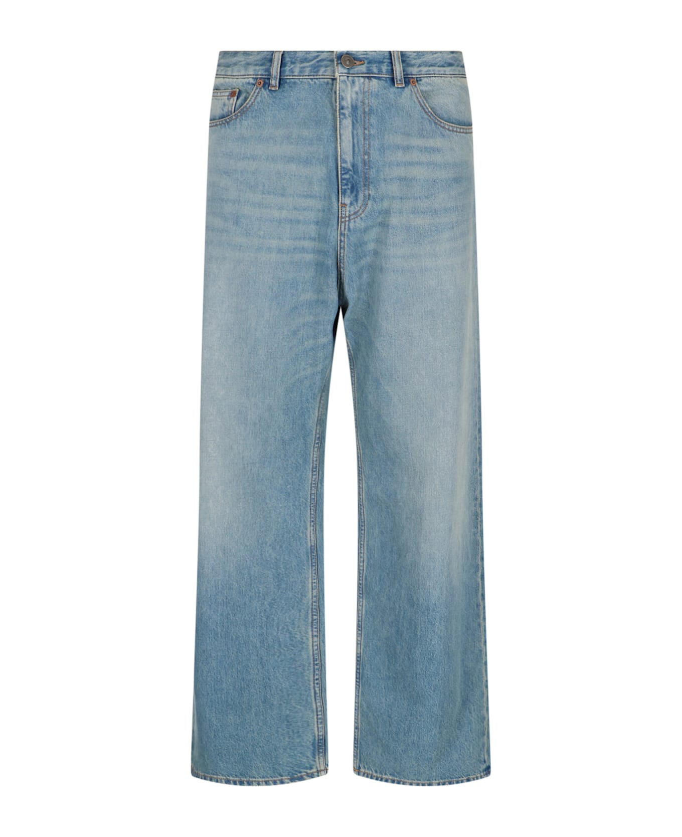 Valentino straight jeans in light blue denim with distressed wash, mid waist, belt loops, button and zip closure, five pocket design, back logo patch, straight leg. Composition: 100% Cotton