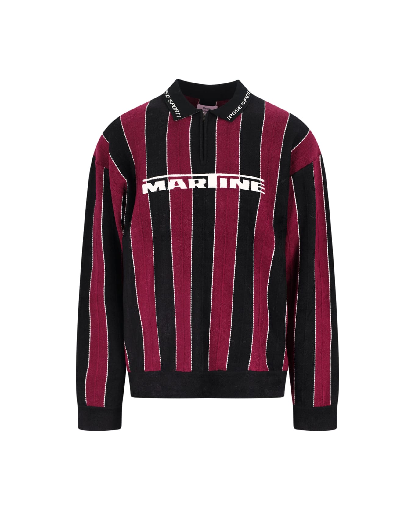 Martine Rose striped polo shirt in black and red viscose blend with dropped shoulders, classic collar, engraved logo detail, zip closure, contrasting logo on the front, ribbed trim, straight hem.