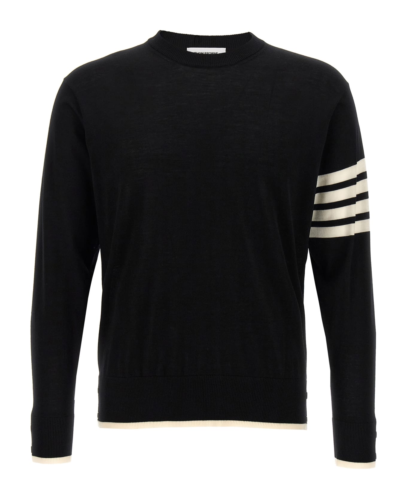 Thom Browne 4- Bar sweater in black virgin wool with contrasting details, crew neck, 4-Bar band appliqué on the sleeve, ribbed trim, and straight hem. Composition: 100% Virgin Wool