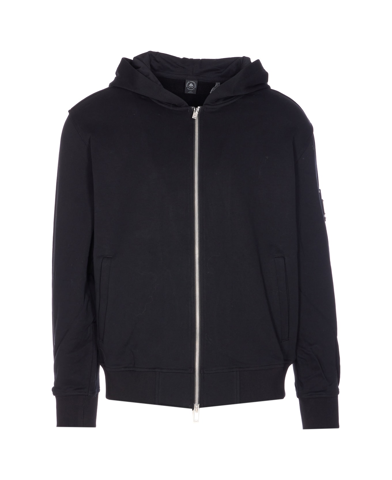 Moose Knuckles black Hartsfield zip hoodie, long sleeves, pockets, hood detail, patch logo on side Composition: 100% Cotton