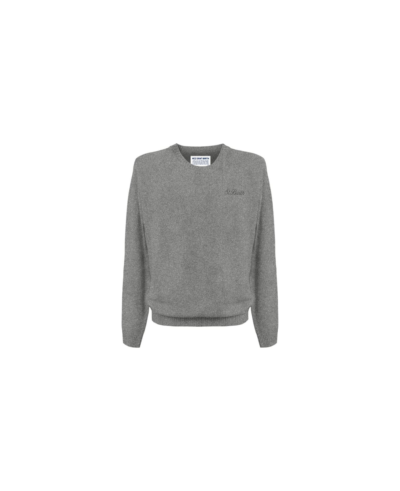 Grey melange Stretch Sweater from MC2 ST. Barth, ribbed collar, cuffs and hem, St Barth logo embroidery on chest pocket. Regular fit