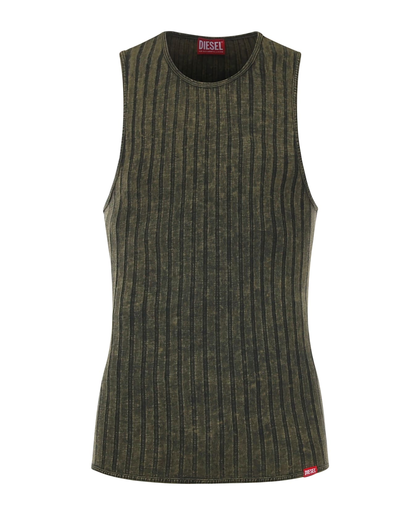 - Made of ribbed cotton - Sleeveless - Crew neck - Logo patch at the bottom - Size shown in photo is M - Color: Olive