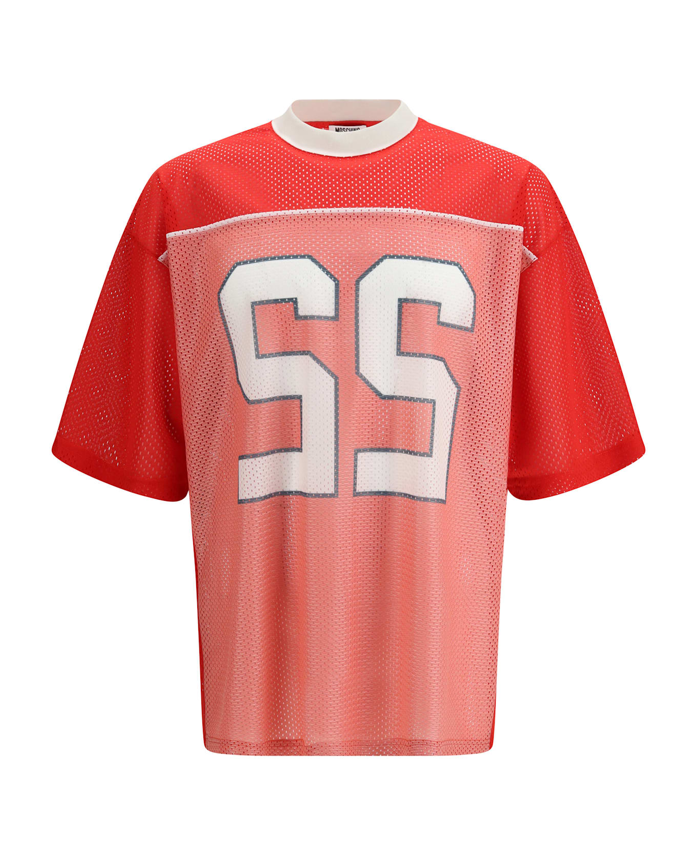 The technical mesh t-shirt by moschino from the spring/summer 2026 collection features a panelled design with a reversed number 22 print placed on the front. designed with a crew neck, wide short sleeves and dropped shoulders, it offers a relaxed and contemporary silhouette. the lightweight, breathable fabric enhances its sporty and graphic appeal, making it a distinctive piece for a modern casual wardrobe.