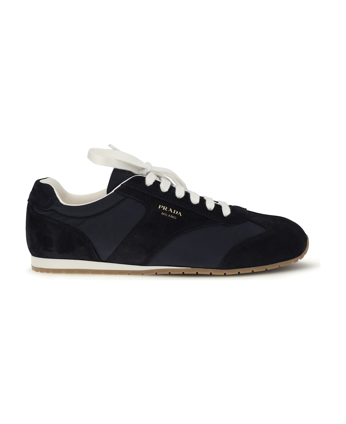 The two-tone suede and fabric sneakers by prada combine comfort and style in a modern and refined design. made from suede and fabric, these sneakers feature a printed logo on the heel and a laminated logo on the side, a distinctive detail that enhances their look. the lace-up closure ensures a secure fit, while the padded ankle provides extra comfort. the embossed logo on the tongue and the printed logo on the inside complete the design, making these sneakers a real must-have for those looking for a mix of elegance and practicality.