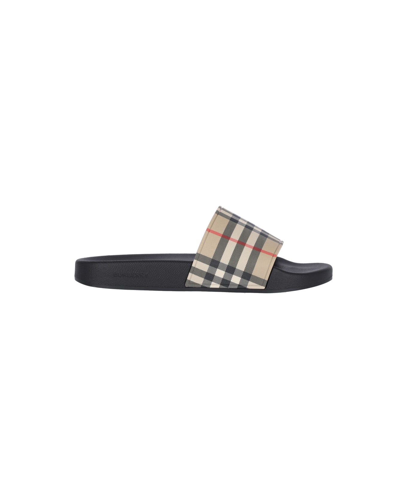 Burberry Tartan Pattern Slide, black rubber, beige, white and red vintage check pattern, round toe, wide upper strap. Composition: 100% Polyurethane