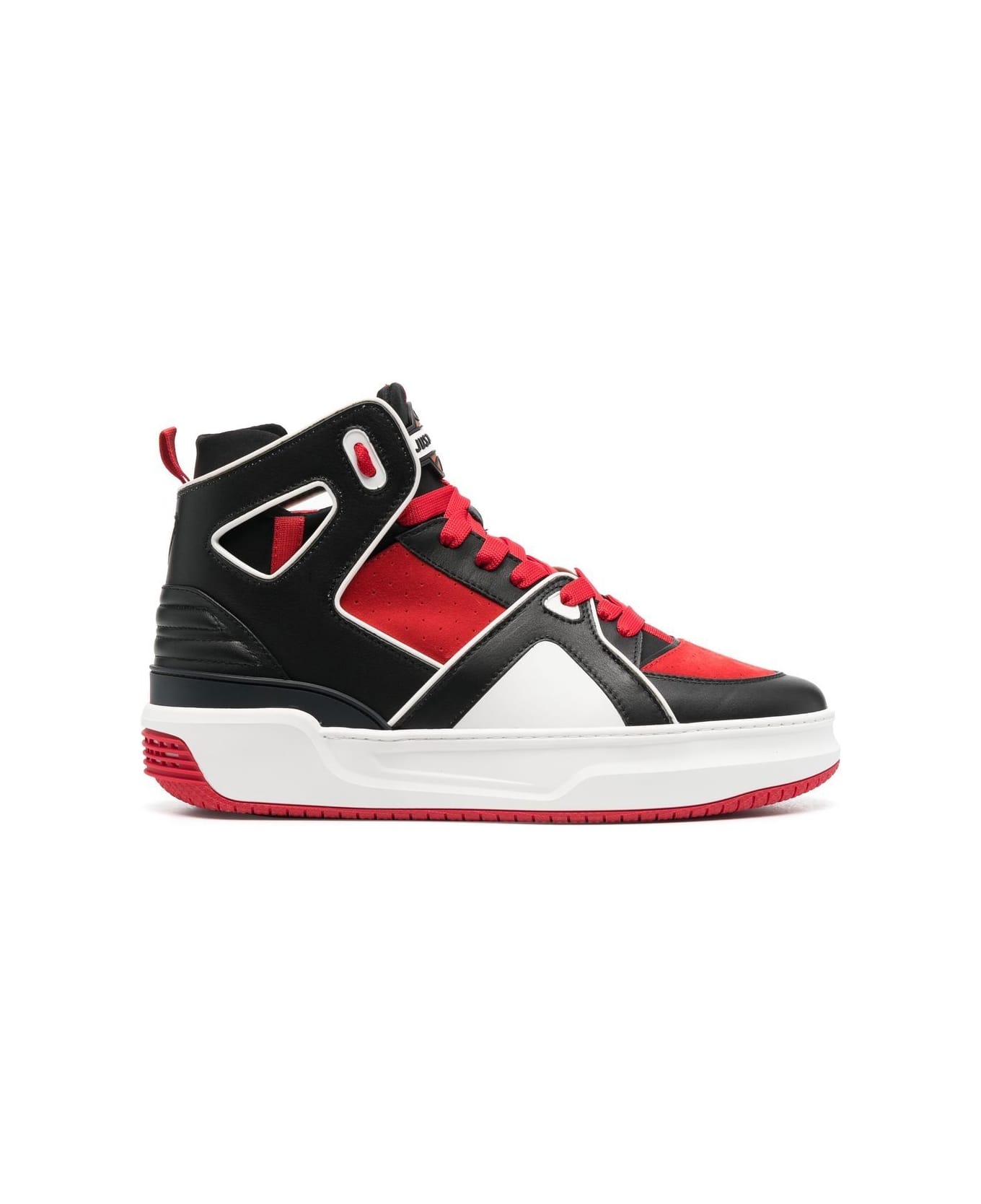 Basketball Courtside high-top sneakers from JUST DON featuring black/white, red, calf leather, logo patch at the tongue, contrasting panel detail, perforated detailing, cut-out detailing, front lace-up fastening, padded ankle and rubber sole.