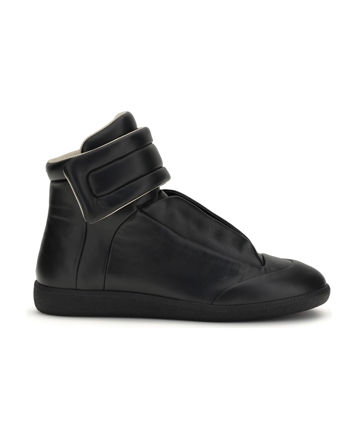 The future sneakers by margiela are a contemporary interpretation of the maison's archive, featuring seamless construction and a hidden closure that enhances their clean, minimalist design. with no visible lacing, a hidden strap crosses the tongue, creating a uniform surface that reflects the concepts of anonymity and sobriety. made from soft calfskin, these mid-top shoes are finished with a tone-on-tone sole and margiela's signature white stitching on the back. a model that combines innovation, elegance, and functionality.