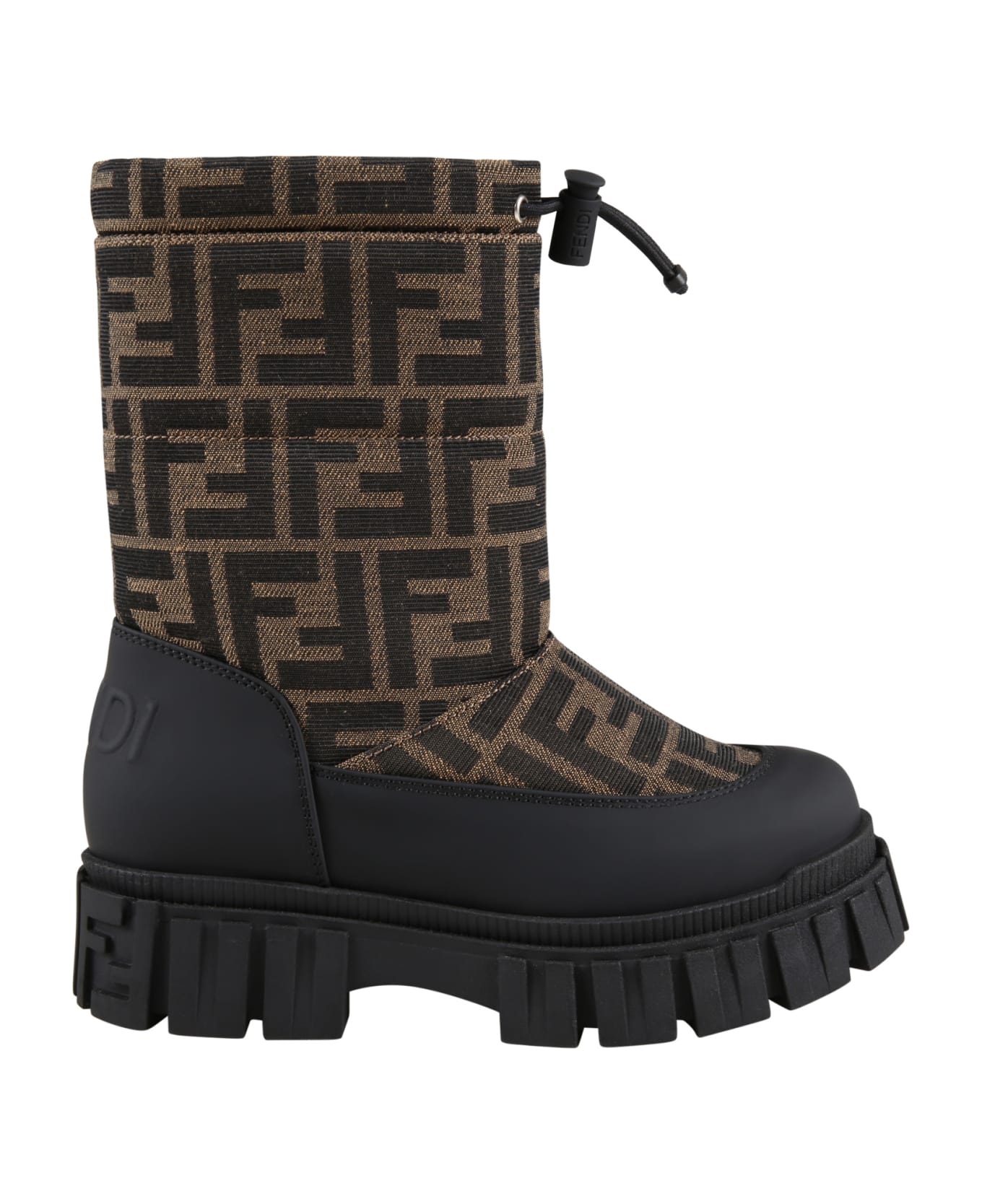 Black snow boots, with rubbered sole and adjustable drawstring, on the hemline; they are embellished with iconic double FF.