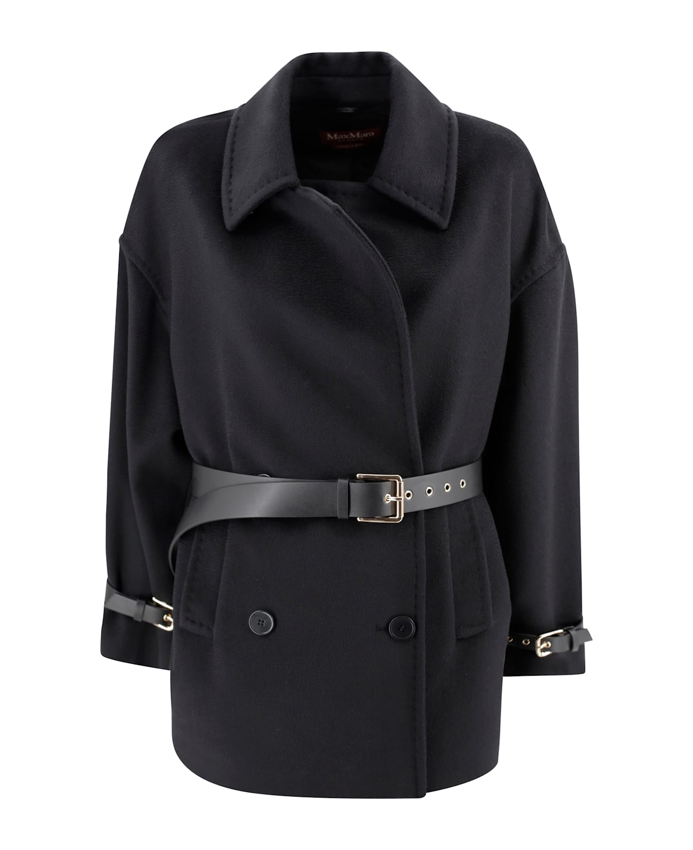 Short wool coat with a structured and contemporary design adds a sophisticated and striking touch to your look; the black color combined with the adjustable waistband enhances the silhouette. Inner lining 100% polyester.