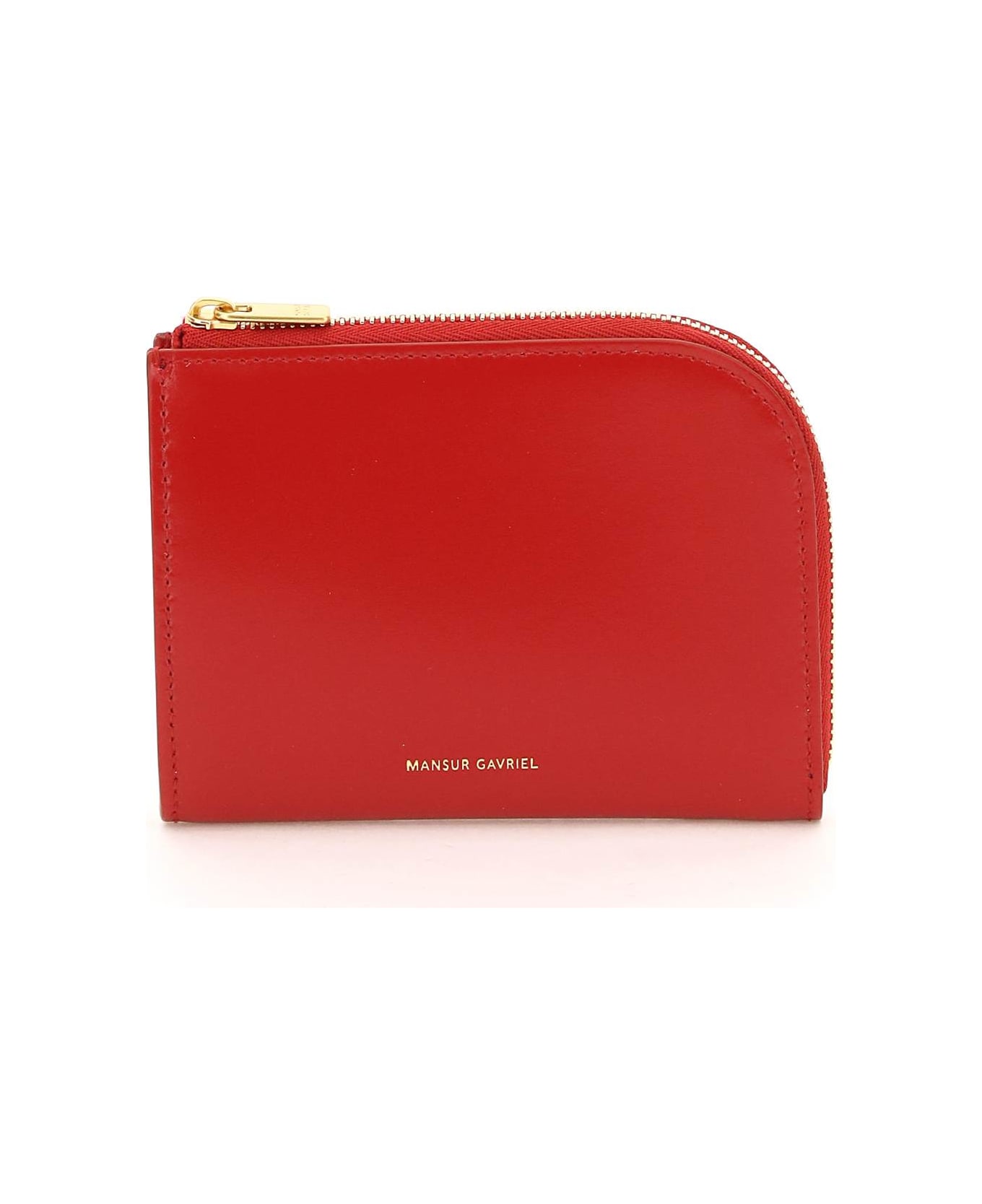 Mansur Gavriel compact wallet crafted in brushed leather with gold-tone logo print on front, gold-tone metal zip closure and leather interior with two credit card slots and an open flat pocket.