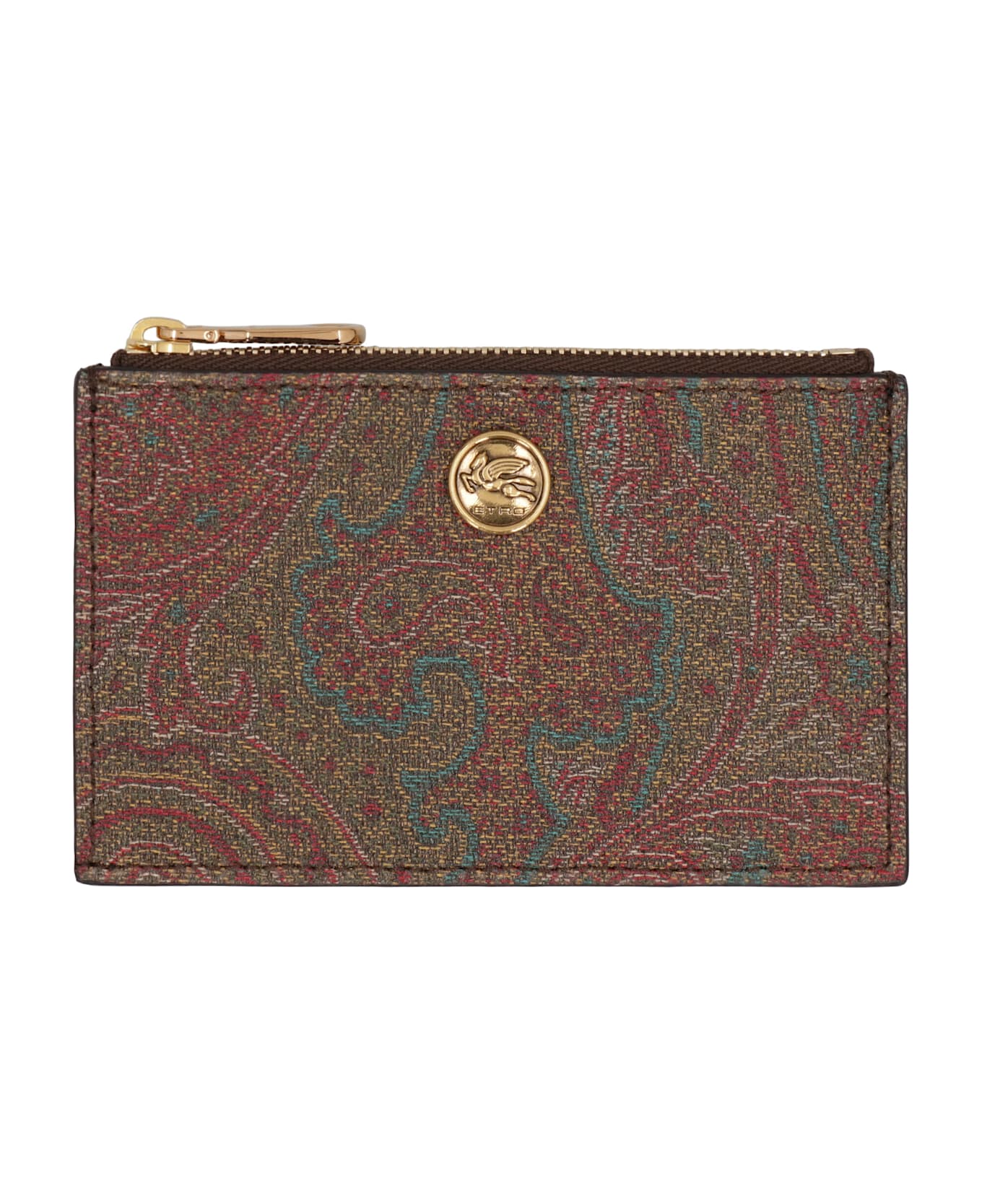 Card holder made of the iconic paisley jacquard fabric with leather details. the accessory features a coin pocket and is enriched with a metallic logo featuring the etro logo and pegasus. the model has four card slots.