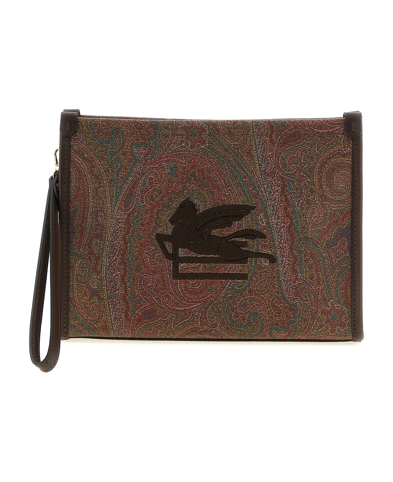 Medium 'Arnica' clutch bag in Paisley jacquard fabric with leather details, front 'Pegaso' logo embroidery, top zip closure, removable wrist lace. Composition: 76% cotton, 24% polyester