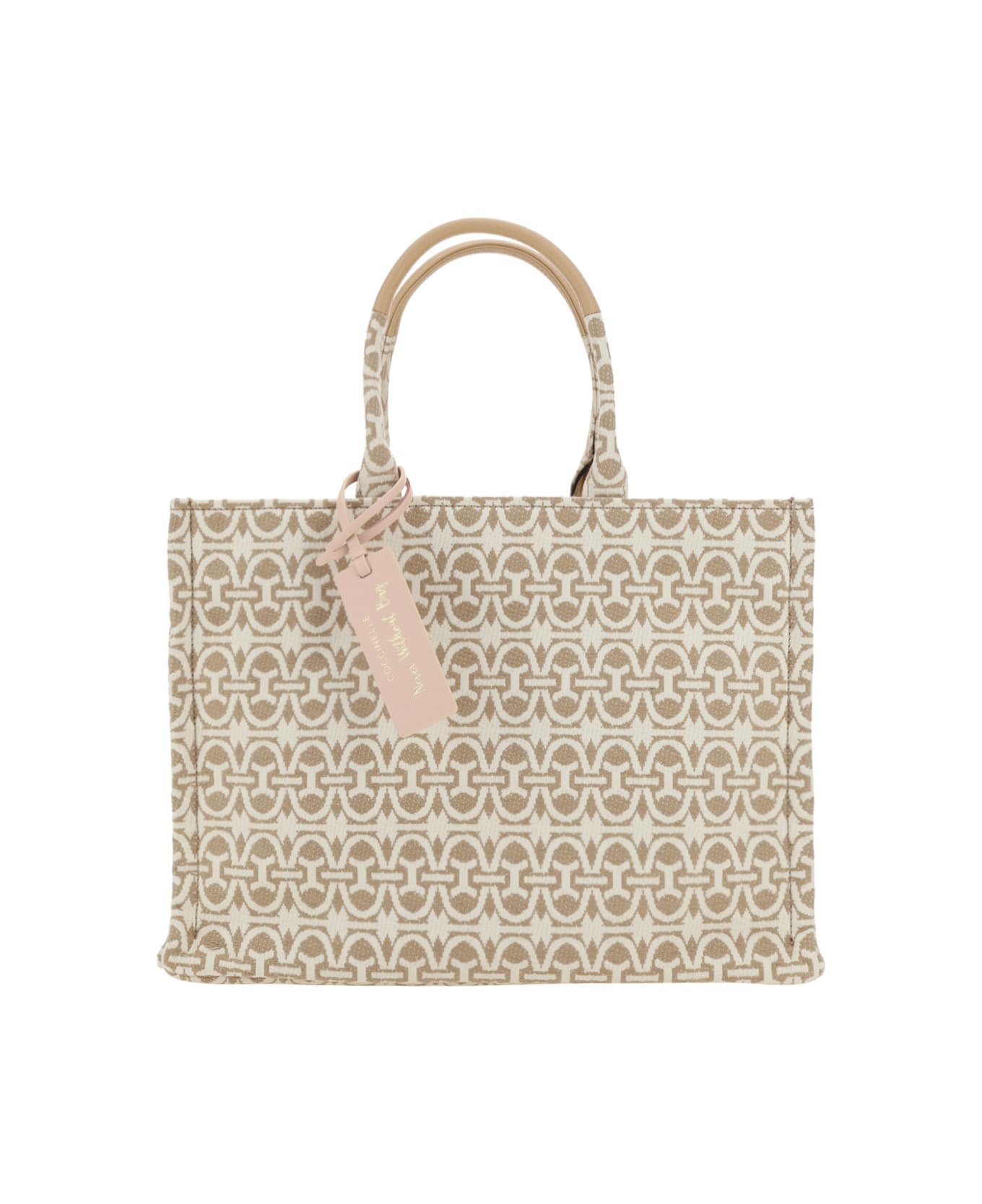 Cotton monogram shopper bag by coccinelle, jacquard fabric design, iconic all-over embroidered brand logo, double stiff top handle, removable and adjustable flat webing shoulder strap, top magnetic closure.