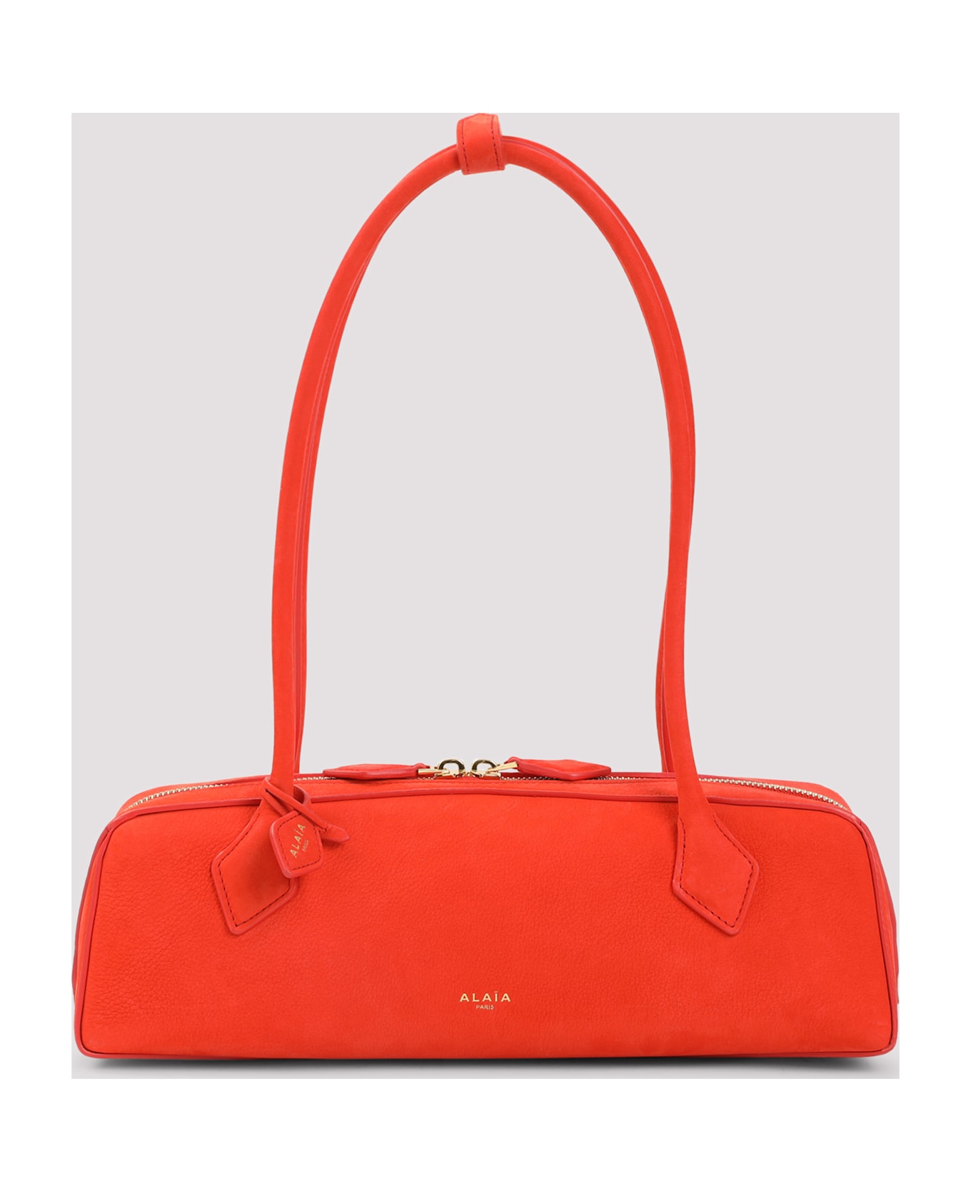 Alaïa Teckel Medium Orange Brule Shoulder Bag. Crafted from orange calf leather, golden-toned hardware, top handles, detachable branded leather tag detail, two-way zip fastening, inner detachable mini mirror and slip pocket, lined.