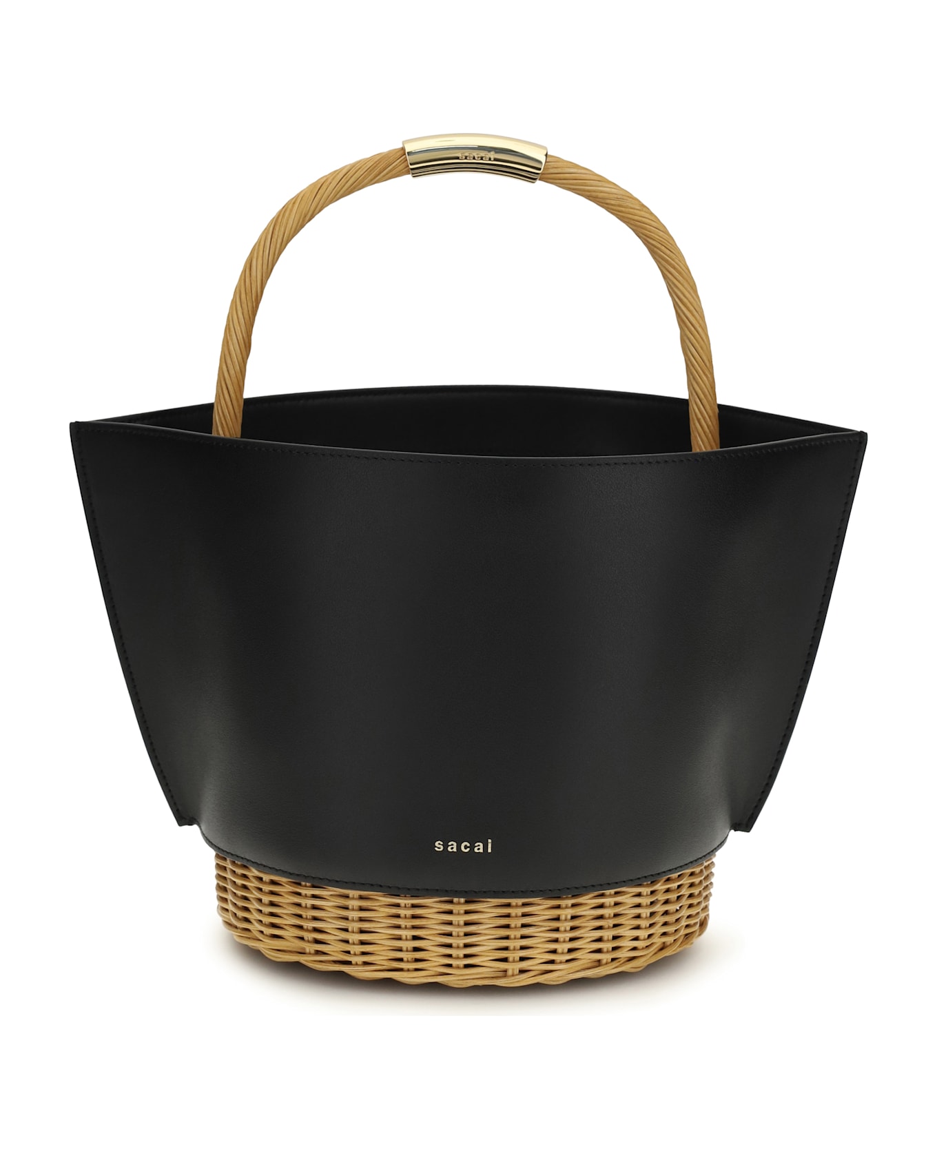 The leather and rattan handbag by sacai is the perfect combination of elegance and functionality. the raffia and leather basket design with a round base evokes a natural and sophisticated charm. the fixed handle with gold metal logo adds a touch of luxury, while the removable shoulder strap, thanks to the internal hooks, offers versatility. with a large open main compartment and a removable leather pouch as an accessory, this bag is ideal for those looking for practical style without sacrificing sophistication.