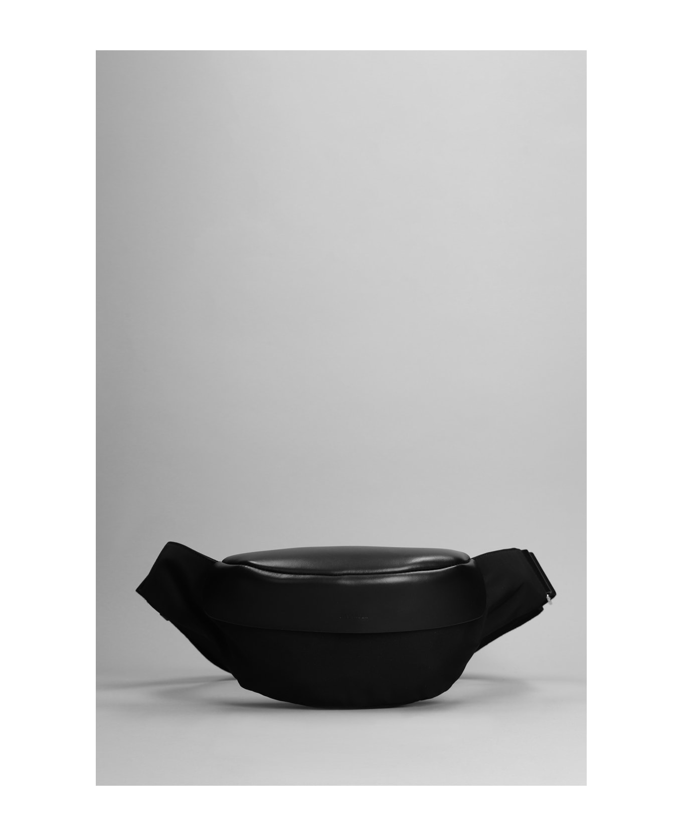 Lid belted Waist Bag in black leather and fabric, Height 150 mm, Width 420 mm, adjustable lenght, zip clousure, mesh details, 100% leather, Made in Italy