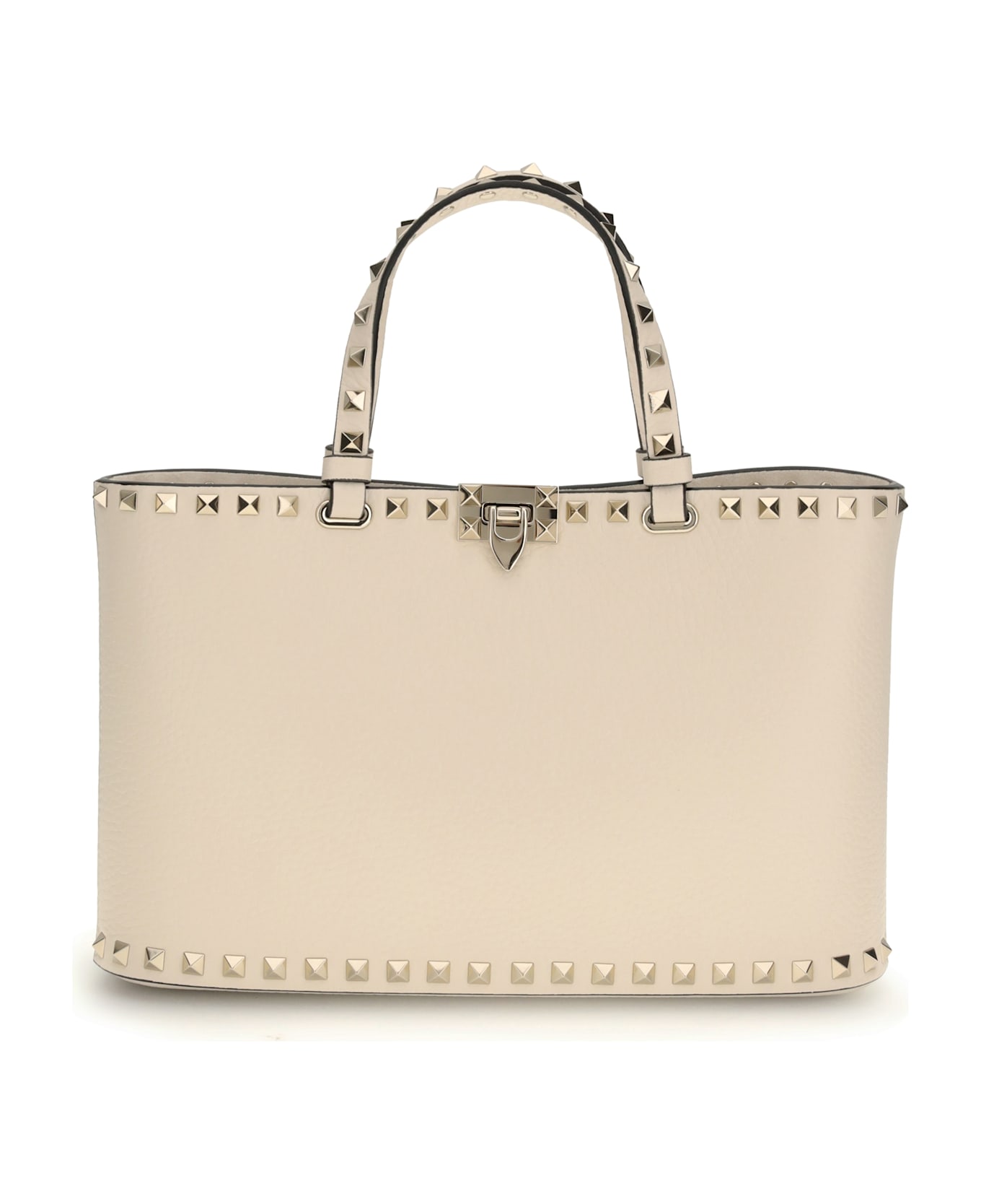 The rockstud small tote bag by valentino garavani is crafted from leather and finished with the brand s iconic studded rockstud edging. the design features double leather handles, a removable and adjustable leather shoulder strap, a metal hook closure, and an internal leather pocket. a sophisticated and distinctive piece that blends elegance with signature detailing. Composition: 100% % Calf Leather Bos Taurus