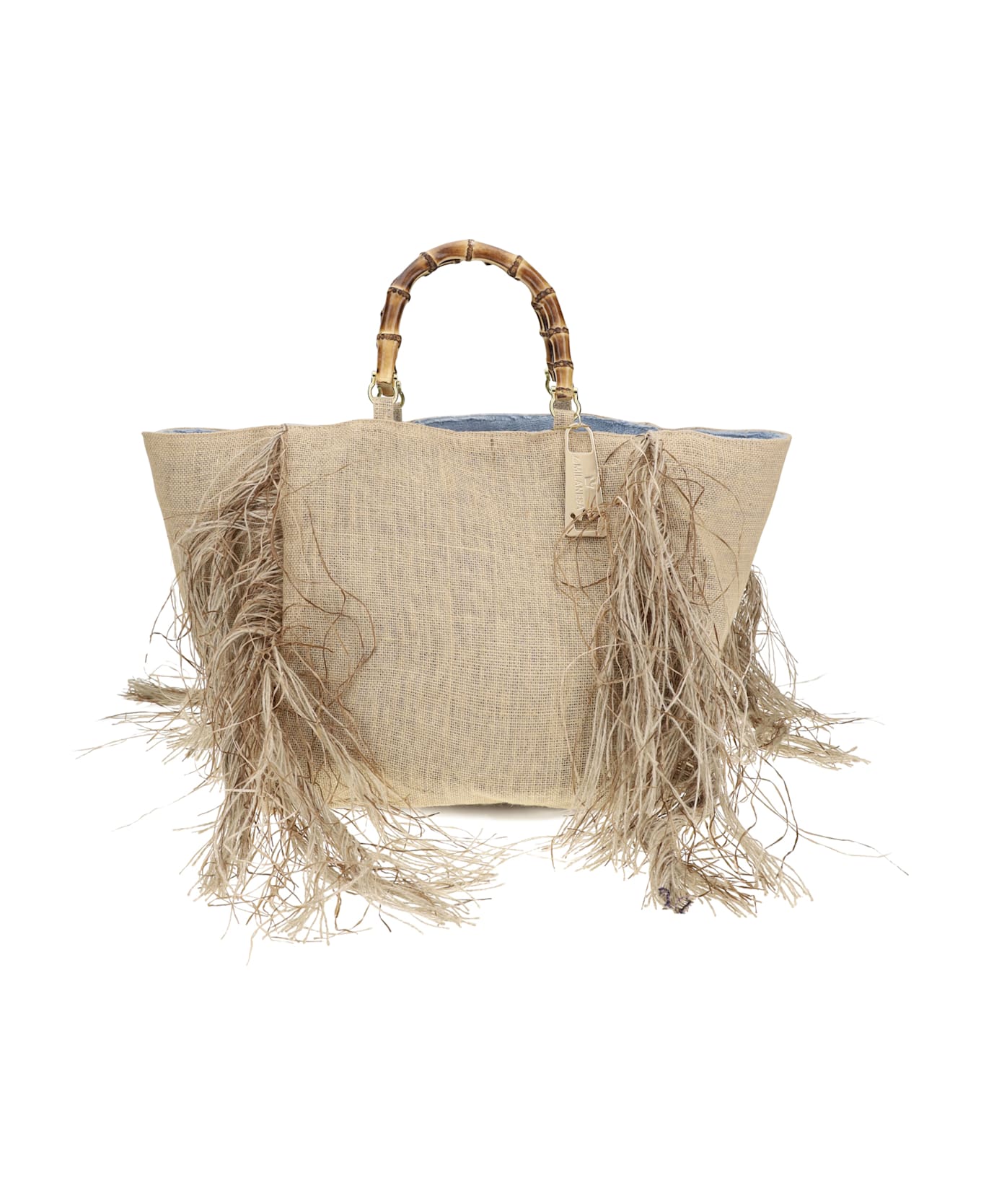 The sharon handbag by la milanesa is made of natural fabric with long side fringes, featuring a soft silhouette and bamboo-effect handle. with its boho and elegant style, it is the perfect accessory for the summer season, ideal for completing relaxed yet refined outfits with a distinctive touch.