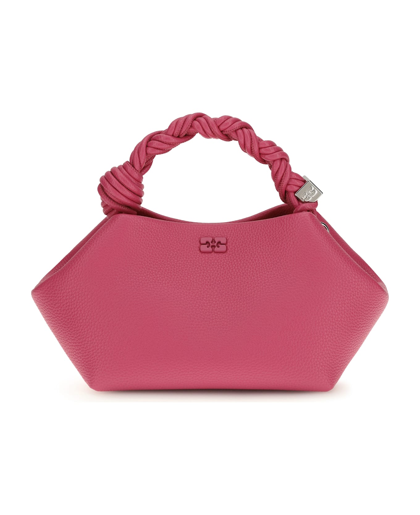 The small bou handbag by ganni, with its grainy texture, combines elegance and functionality in a compact design. featuring the tone-on-tone ganni butterfly logo and embossed logo on the back, it has a braided top handle with knot, adjustable and removable shoulder strap, and metal nuts engraved with the ganni and butterfly logos. the internal magnetic closure and two internal compartments complete the bag, offering practicality and style.