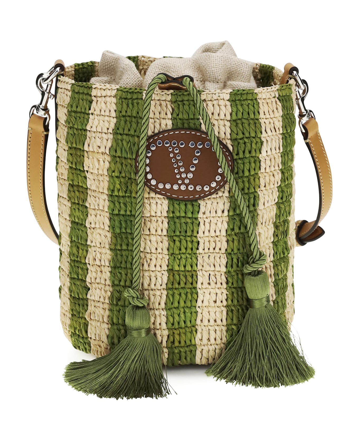 The striped raffia bucket bag by valentino garavani is a chic and functional summer accessory. small and compact, it features palladium-finish hardware, a drawstring closure, and protective feet, perfect for adding a touch of elegance to casual or vacation looks. Composition: 100% % Raffia