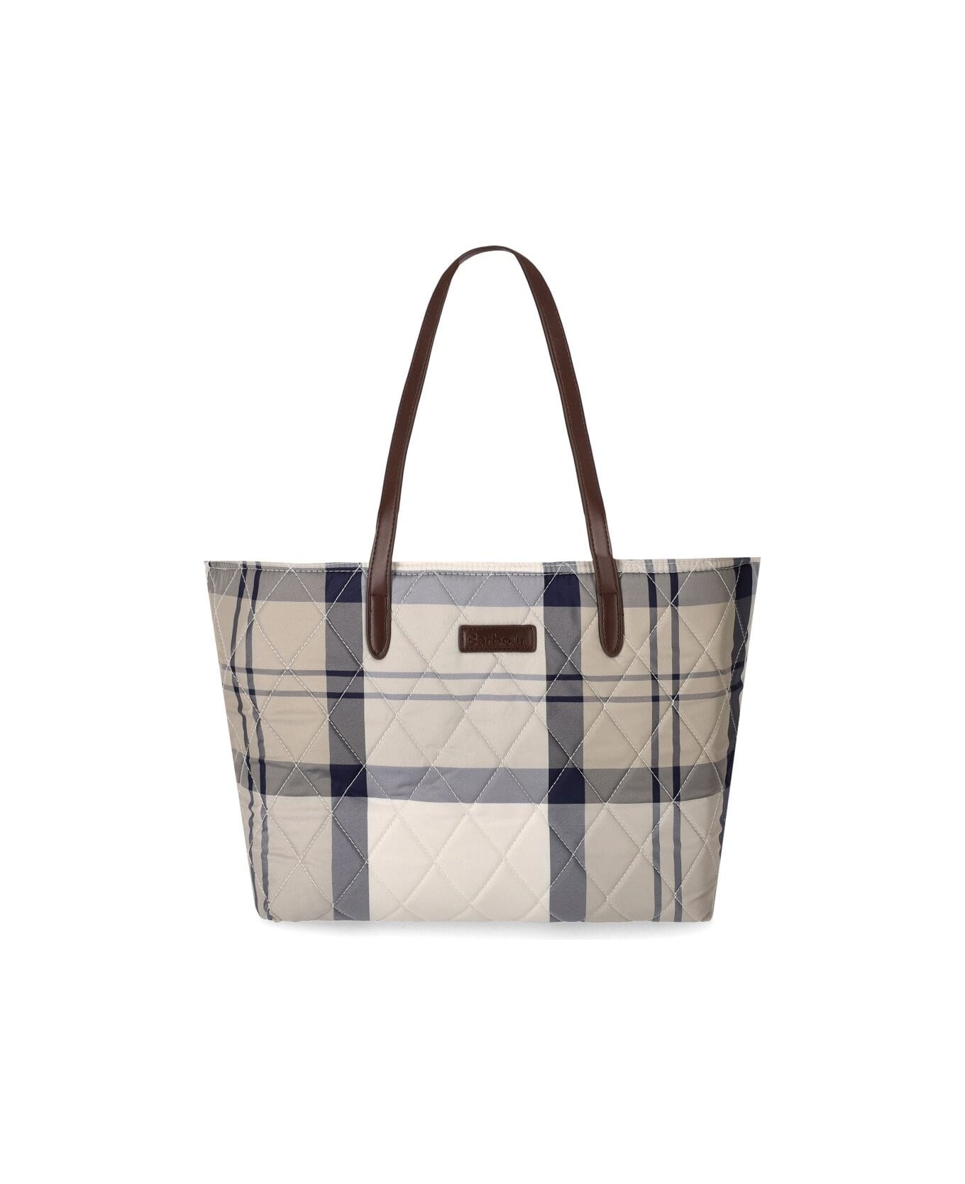 Barbour Wetherham shopping bag made of quilted nylon with iconic tartan pattern in shades of blue and beige. Lined interior with slip pockets and coin purse, brown leather handles and logo plate on the front. Zip closure, measures 30x33x12 cm. Composition: 100% polyester.