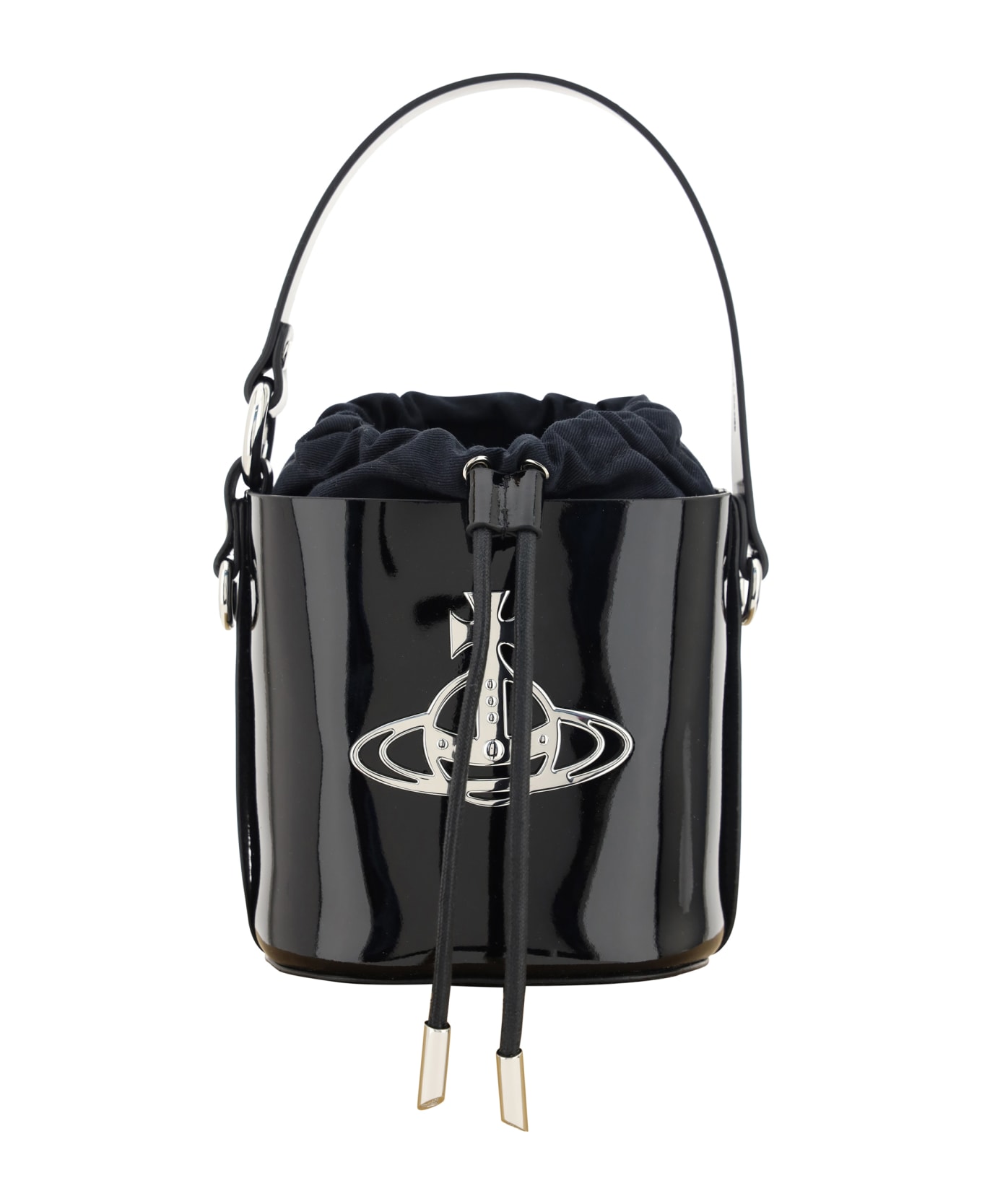 Calfskin daisy bucket bag by vivienne westwood, flat top handle, adjustable drawstring top closure, iconic embossed and contrasting orb logo on front, shiny mirrored leather design. Composition: 100% % Calf Leather Bos Taurus