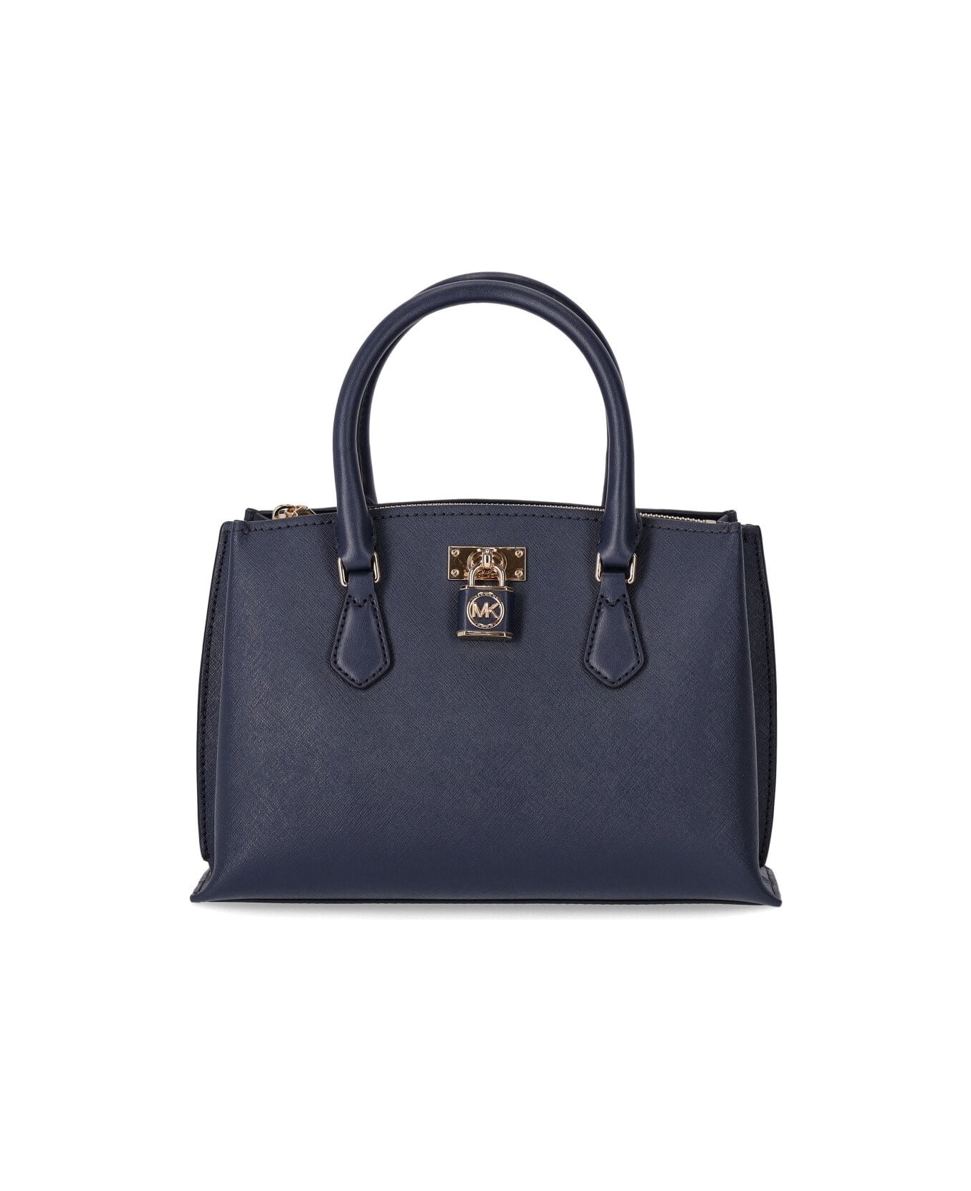 Ruby handbag by Michael Kors made of blue saffiano leather. Golden metal details and logo padlock on the front. Lined interior, equipped with slip pockets, magnetic closure and zipped compartment. Top handles and adjustable and removable shoulder strap with chain insert. Measures 26. 6x17. 7x12. 7cm.