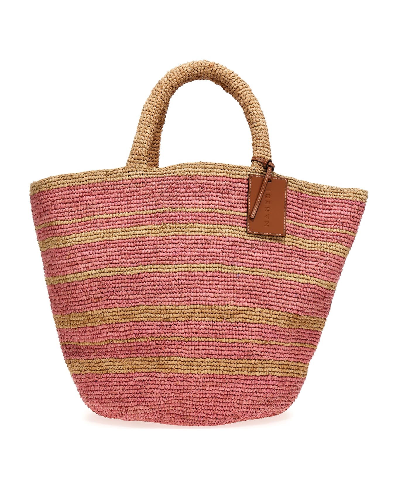 Summer Bag' striped raffia shopping bag with double handle and a leather logo tag.