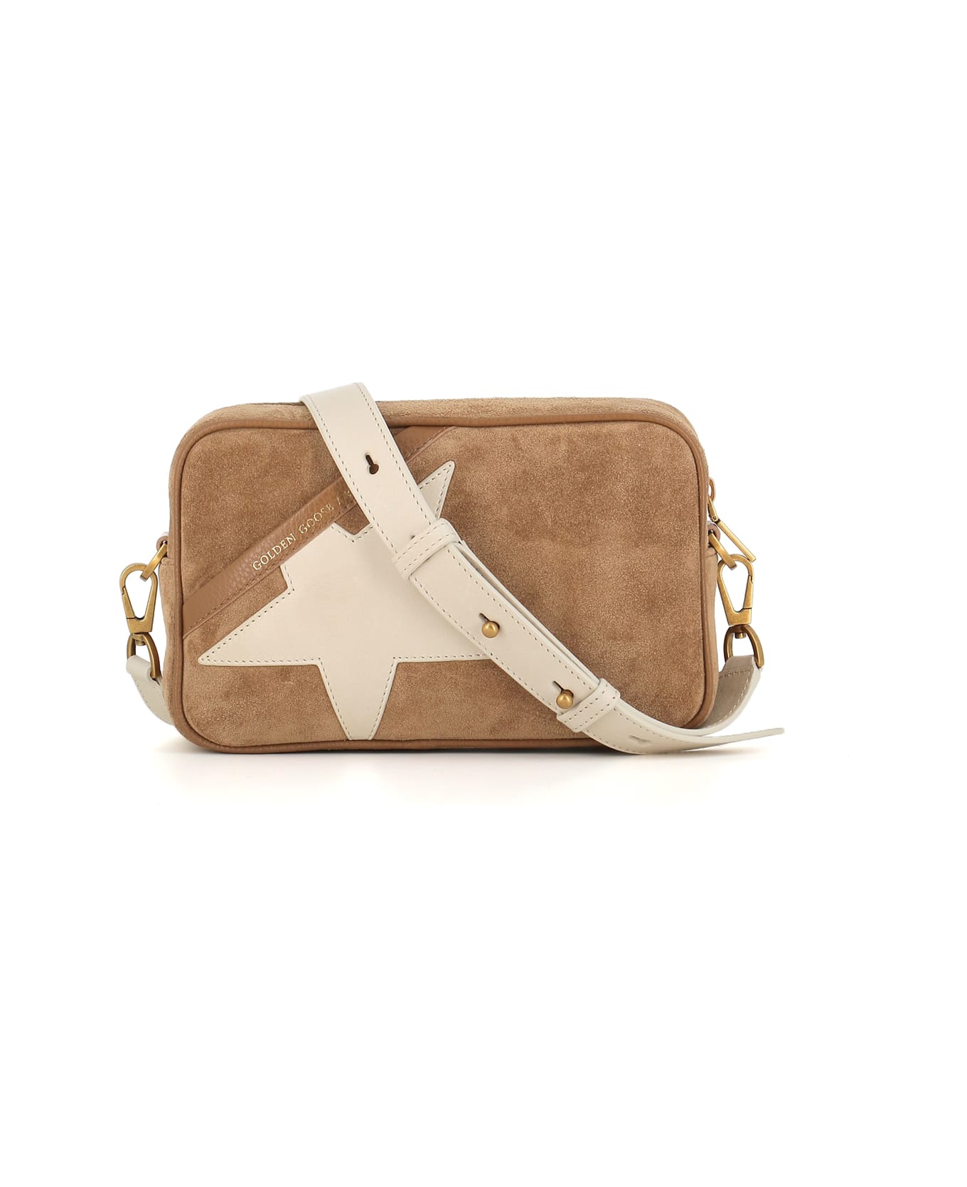 Beige suede Bag Golden Goose, featuring by white logo decorating on the front. Nylon lining. Adjustable shoulder strap. Dimensions: 8 x 15 x 23 cm