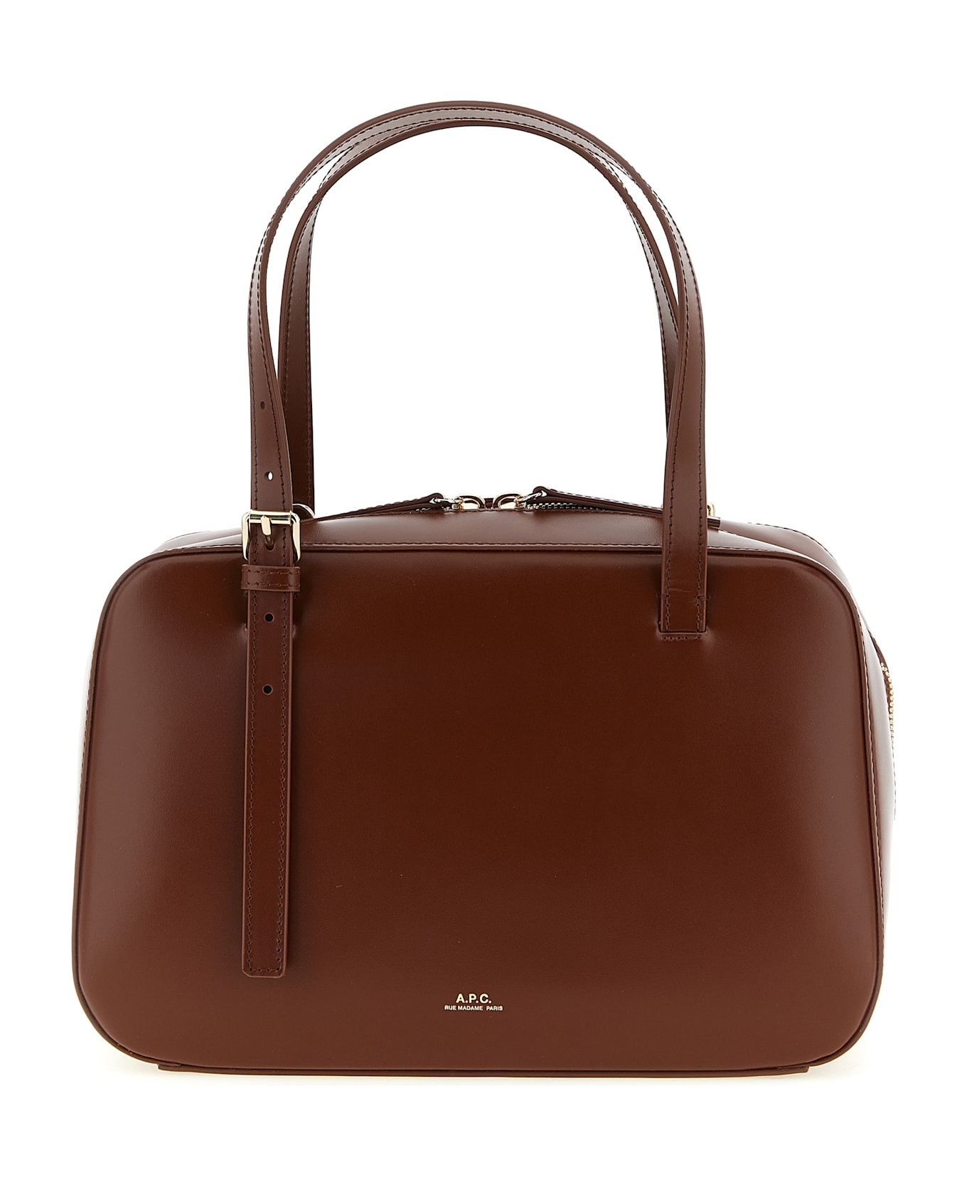 'Virginie Box' smooth leather handbag with front embossed 'A. P. C. Rue Madame Paris' logo, top zip closure, double adjustable handle, cotton lining, adjustable and removable shoulder strap.