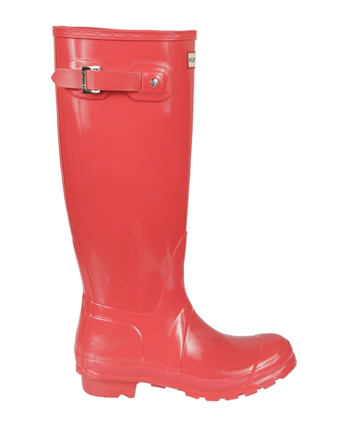 Coral Red Buckle Knee Length Rain Boots from Hunter Rubber upper and sole Shaft measures approx 37 cm H Side buckle detail